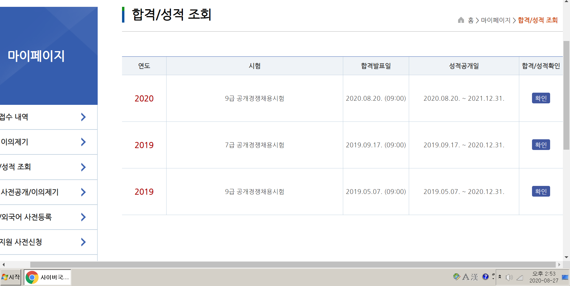 2020년도 제1회 인천광역시 지방공무원(일반행정, 세무, 사회복지 외) 임용시험 필기시험 합격선(커트라인) (0) | 2020.08.27 |