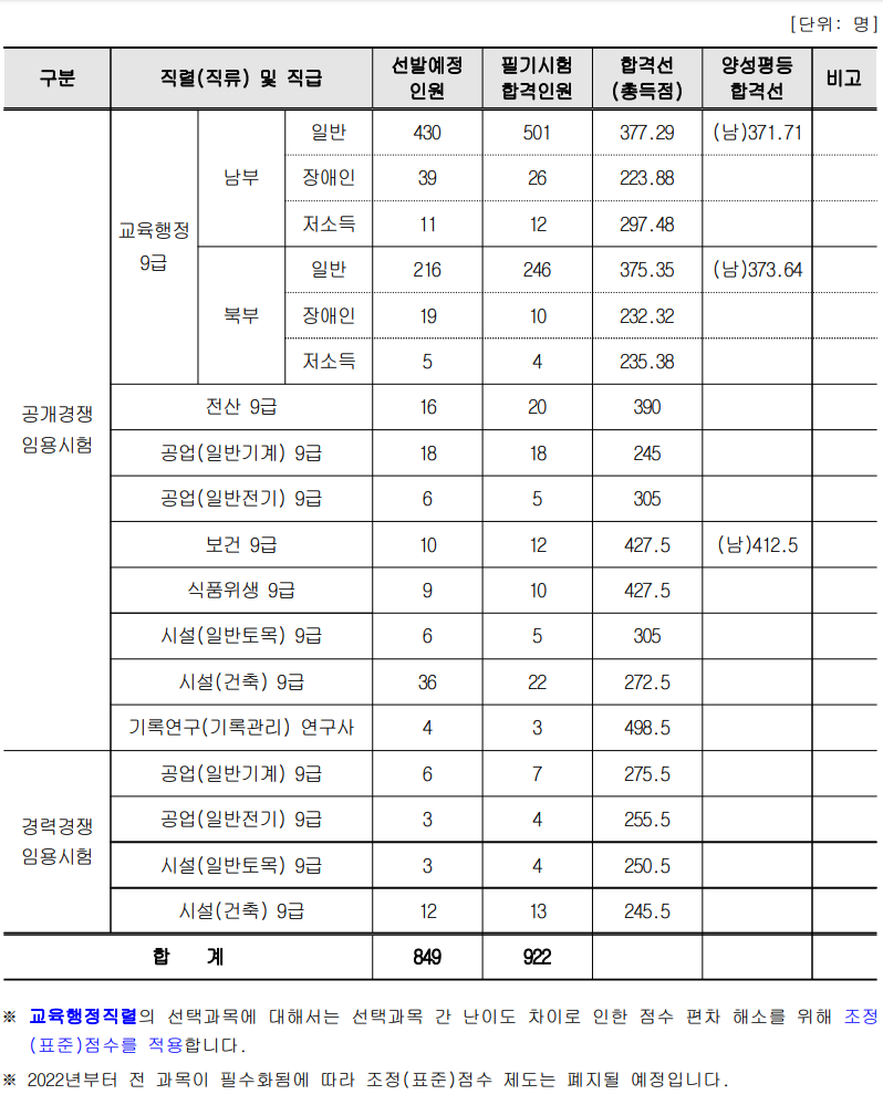 - 교육행정 9급 북부: 375.35(양성평등: 373.64)
