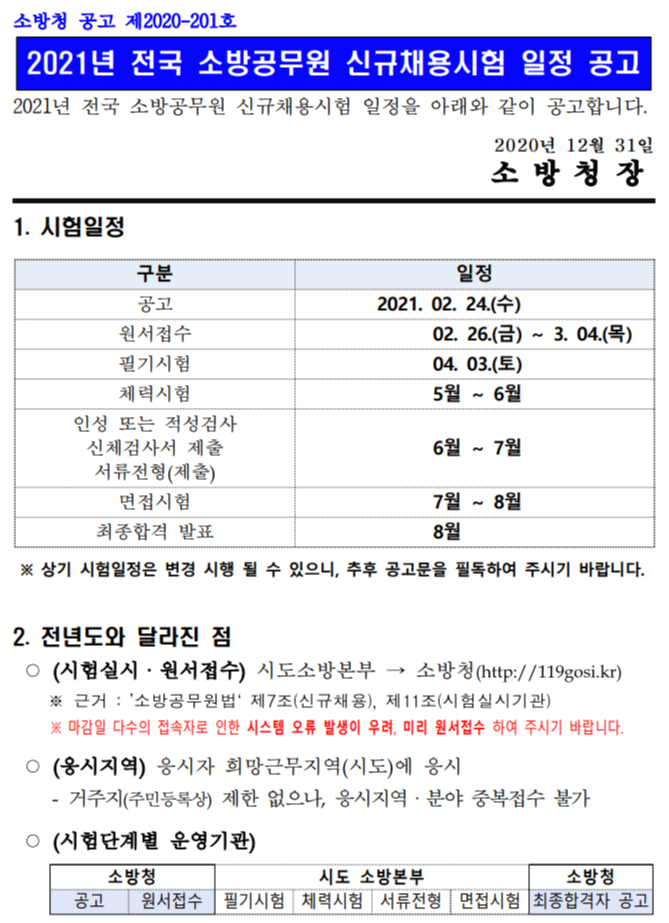 2021년 전국 소방공무원 신규채용시험 일정 공고입니다.