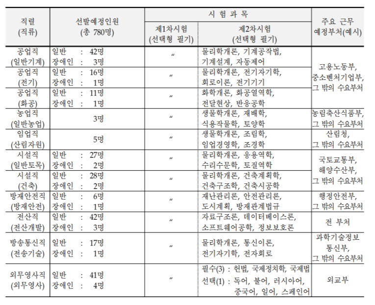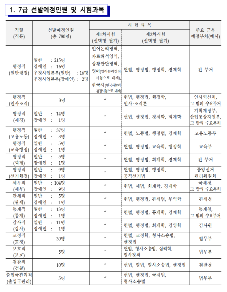 2021년 국가공무원 7급 공개경쟁채용시험 선발예정인원 및 시험과목입니다.