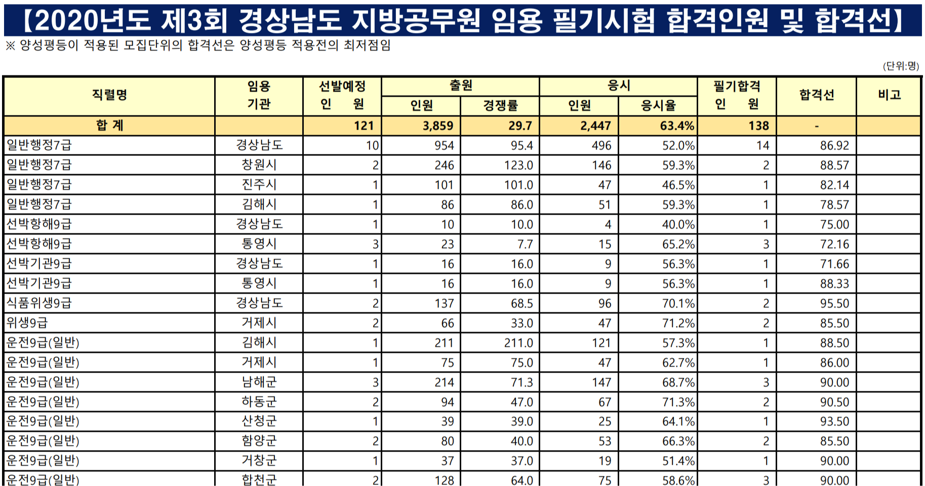 2020년도 제3회 경상남도(경남) 지방공무원(7급) 임용 필기시험 합격선(커트라인)입니다.