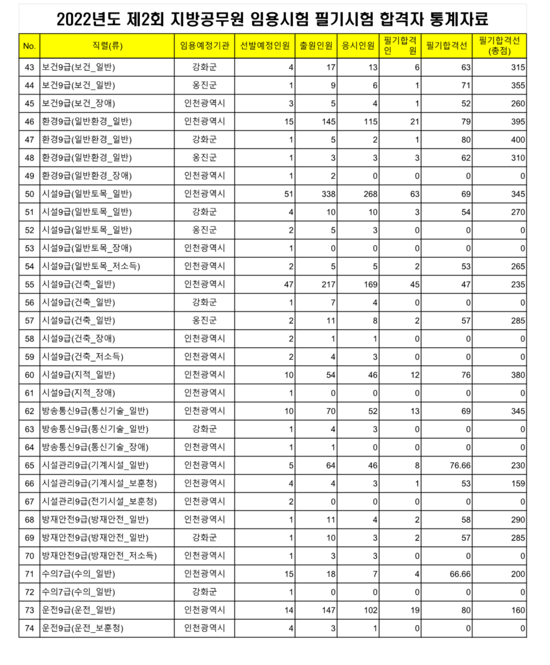 2022년도 제2회 인천광역시 지방공무원(9급 행정, 사회복지, 세무 등) 임용시험 필기시험 합격선(커트라인)