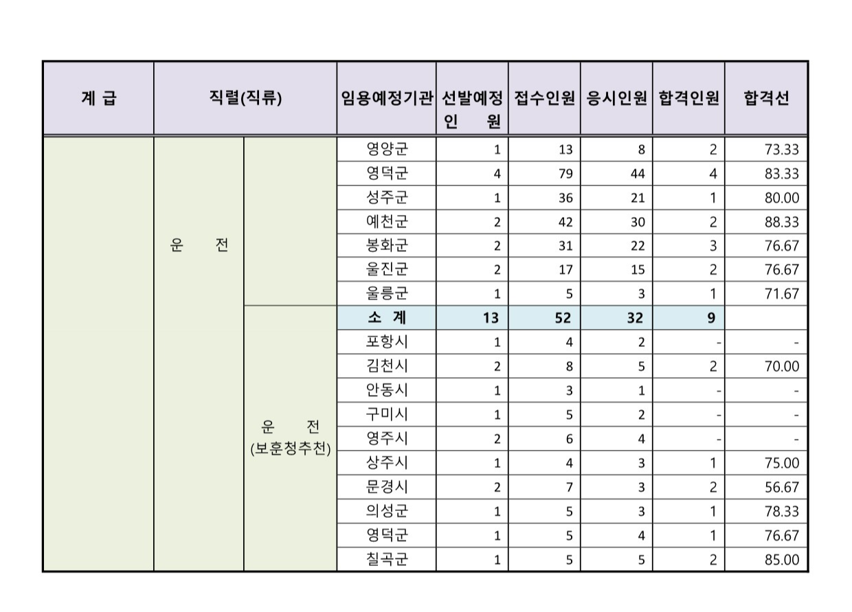 2022년도 제2회 경상북도(경북) 지방공무원(9급 일반행정, 사회복지, 시설 등) 공개경쟁임용 필기시험 합격선(커트라인)