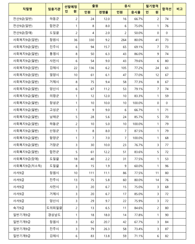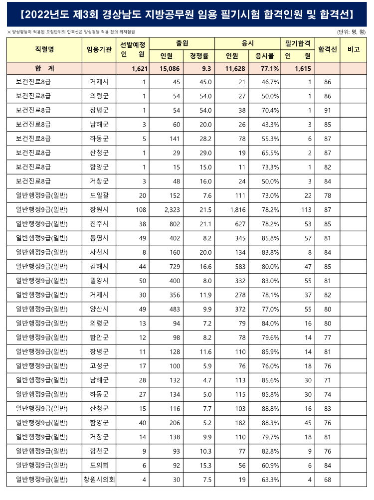 2022년도 제3회 경상남도(경남) 지방공무원(9급 일반행정, 사회복지, 시설 등) 임용 필기시험 합격선(커트라인)
