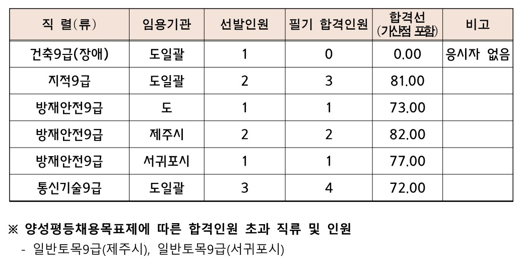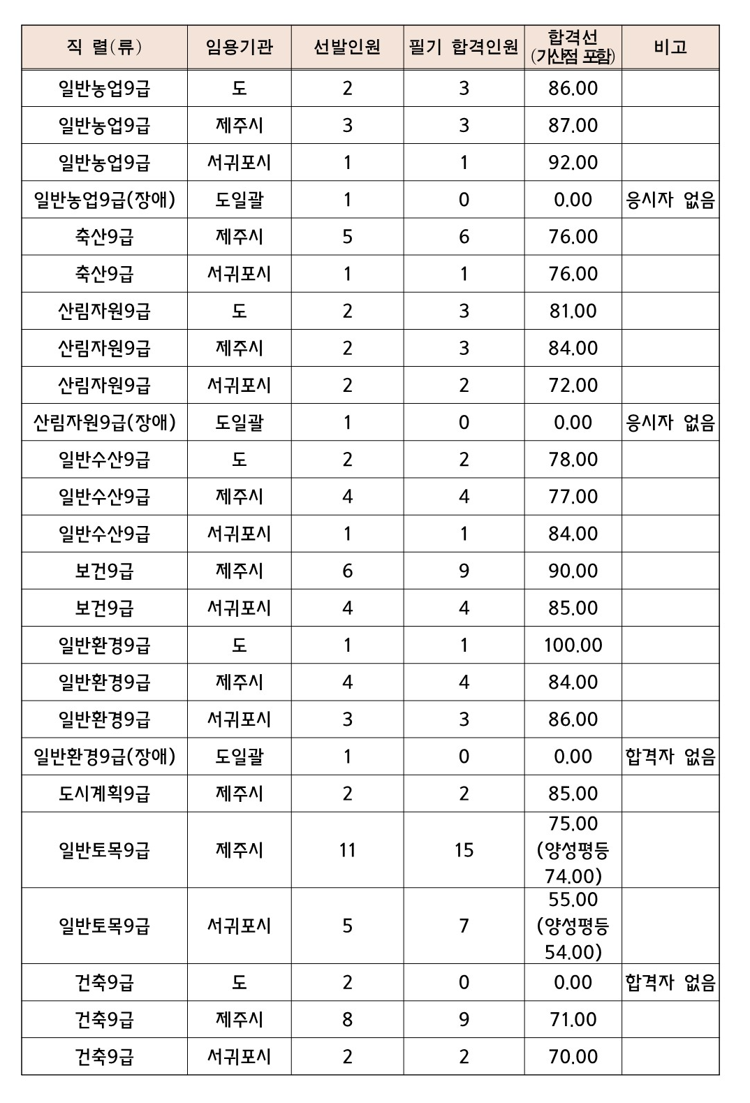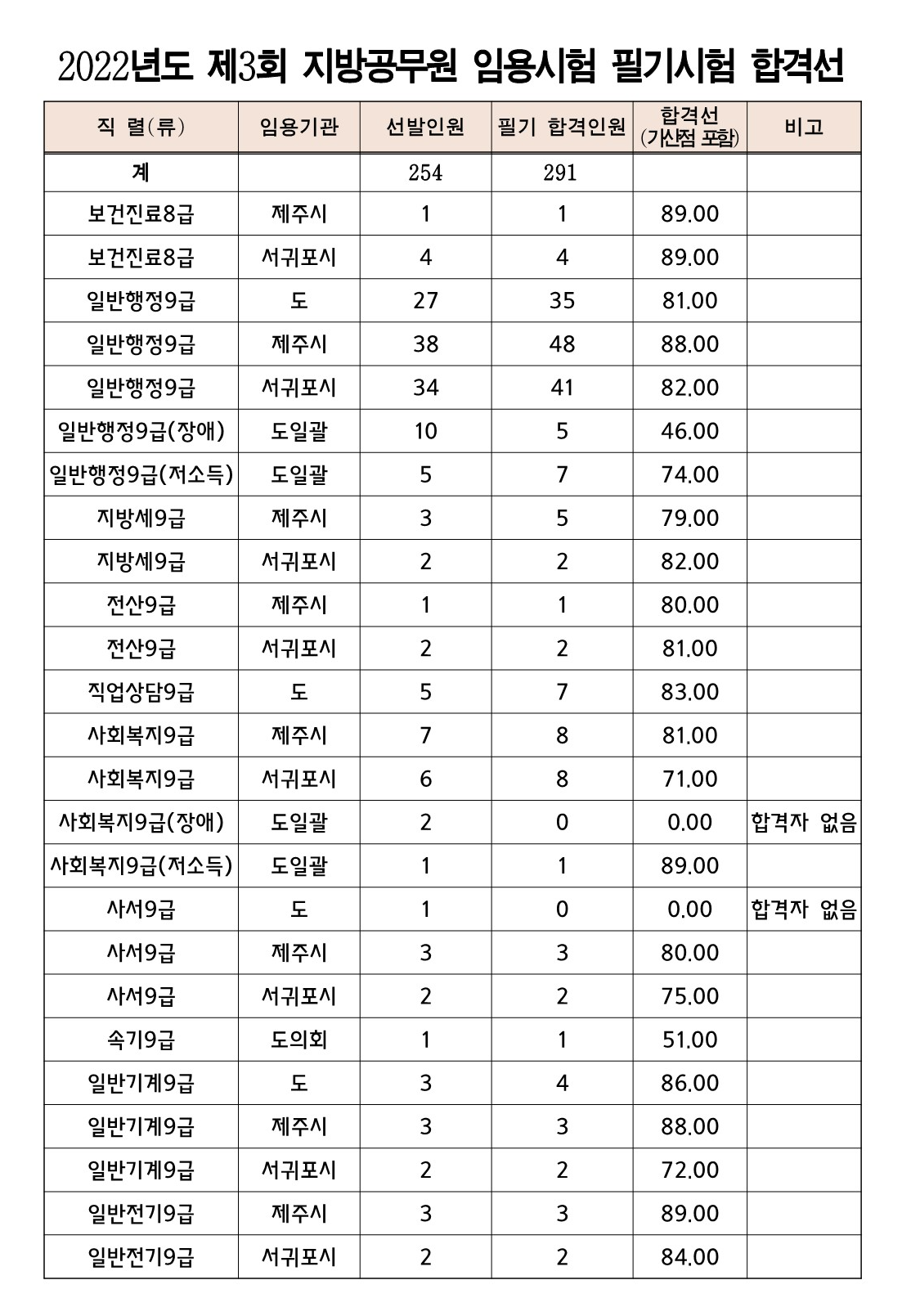 2022년 제주 제3회 지방공무원(8,9급) 임용시험 합격선입니다.