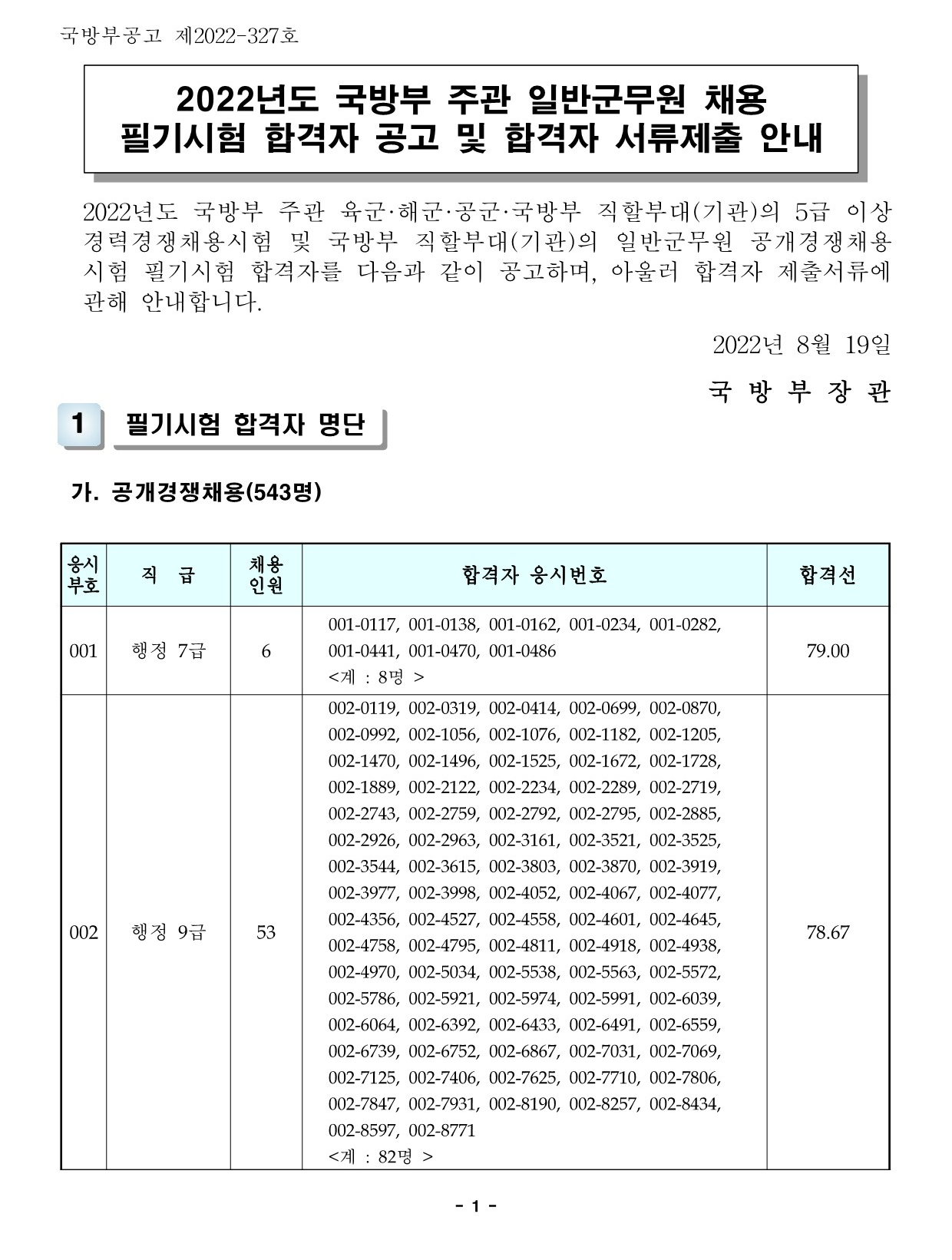 2022년도 국방부 주관 일반군무원(7급/9급 행정, 사서, 군사정보 외) 채용 필기시험 합격선(커트라인)입니다.