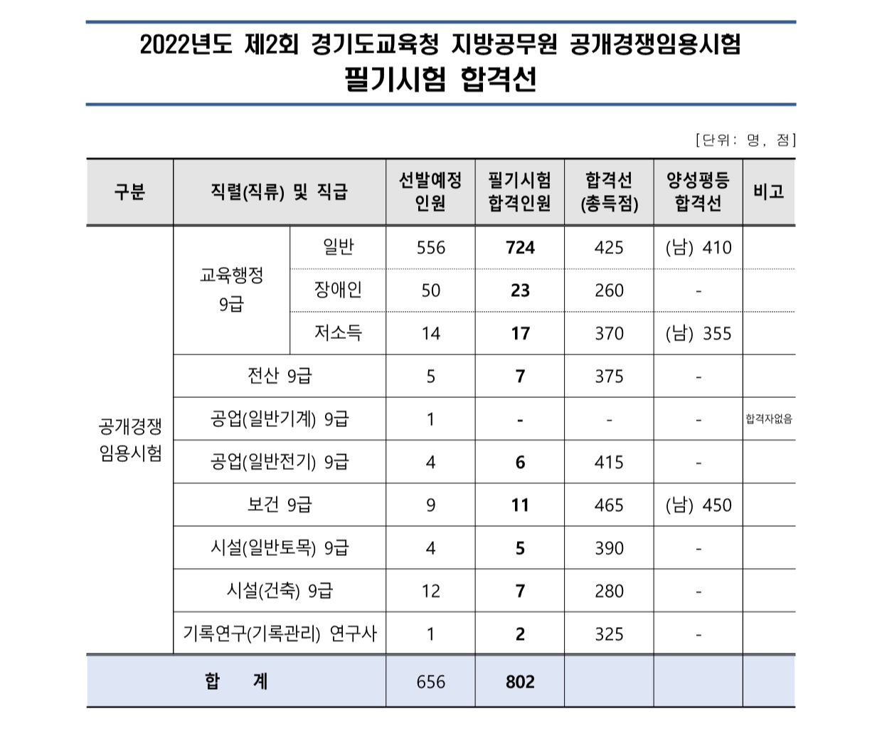 2022년도 제2회 경기도교육청(경기교행) 지방공무원(9급 교육행정 등) 공개경쟁임용시험 필기시험 합격선(커트라인)입니다.