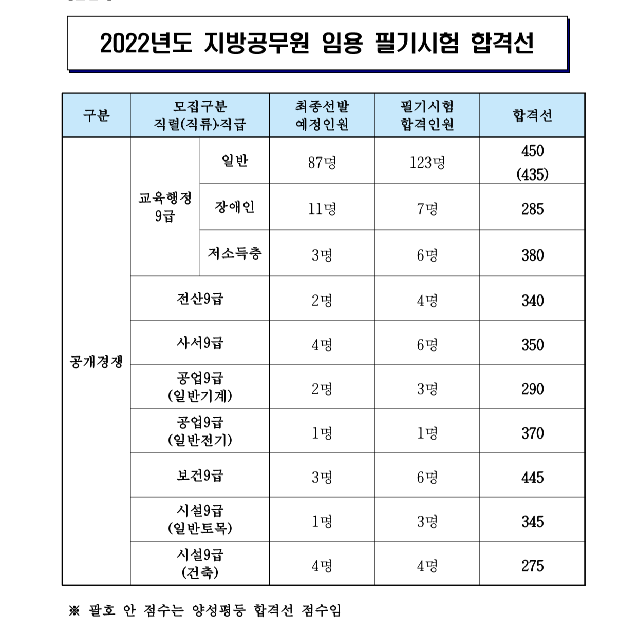 | 2022년도 제1회 서울특별시교육청(서울교행) 지방공무원 9급 공개‧경력경쟁임용시험 필기시험 합격선(커트라인) (0) | 2022.12.22 |