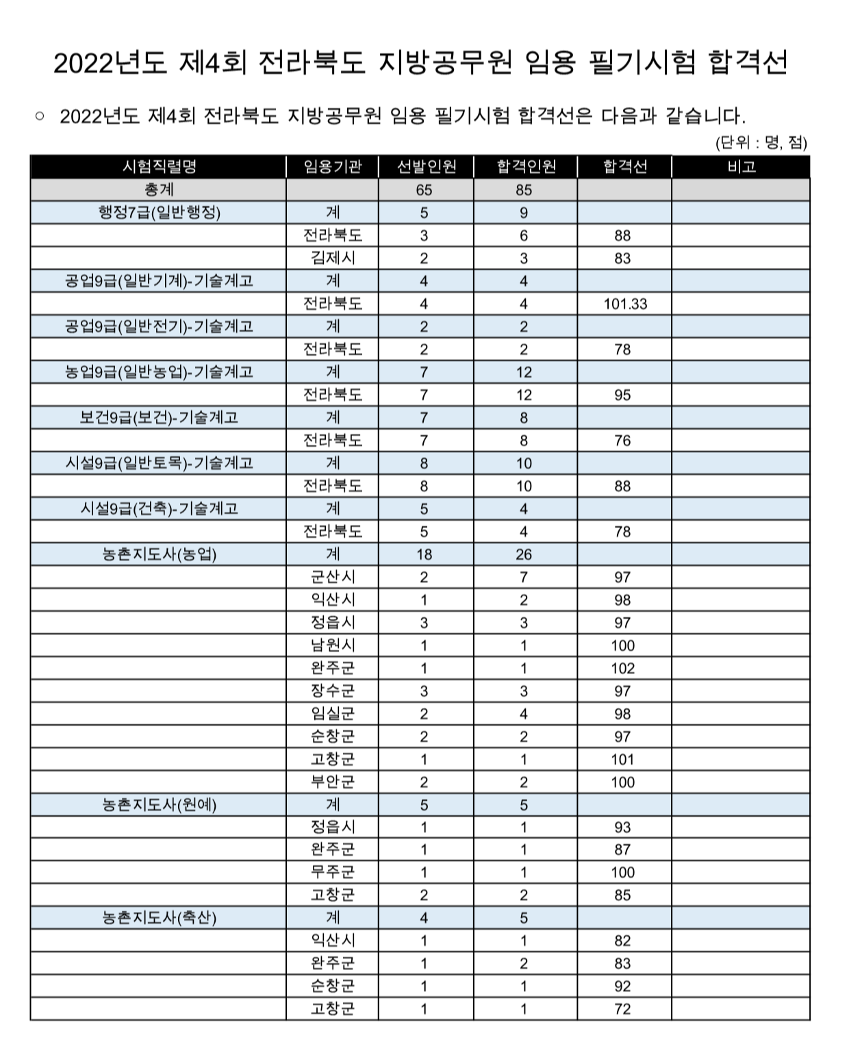 2022년도 제4회 전라북도(전북) 지방공무원(7급 일반행정 등) 임용 필기시험 합격선(커트라인)입니다.