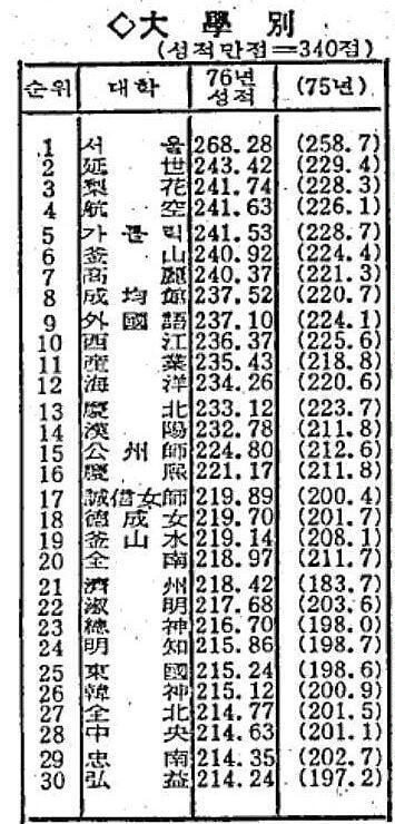 <1970년대 대학순위(1976년 예비고사 평균점수)>