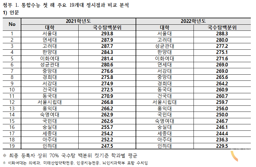 <2020년대 대학 순위(2021년 주요 19개 대학 수능 백분위 평균; 종로학원)>