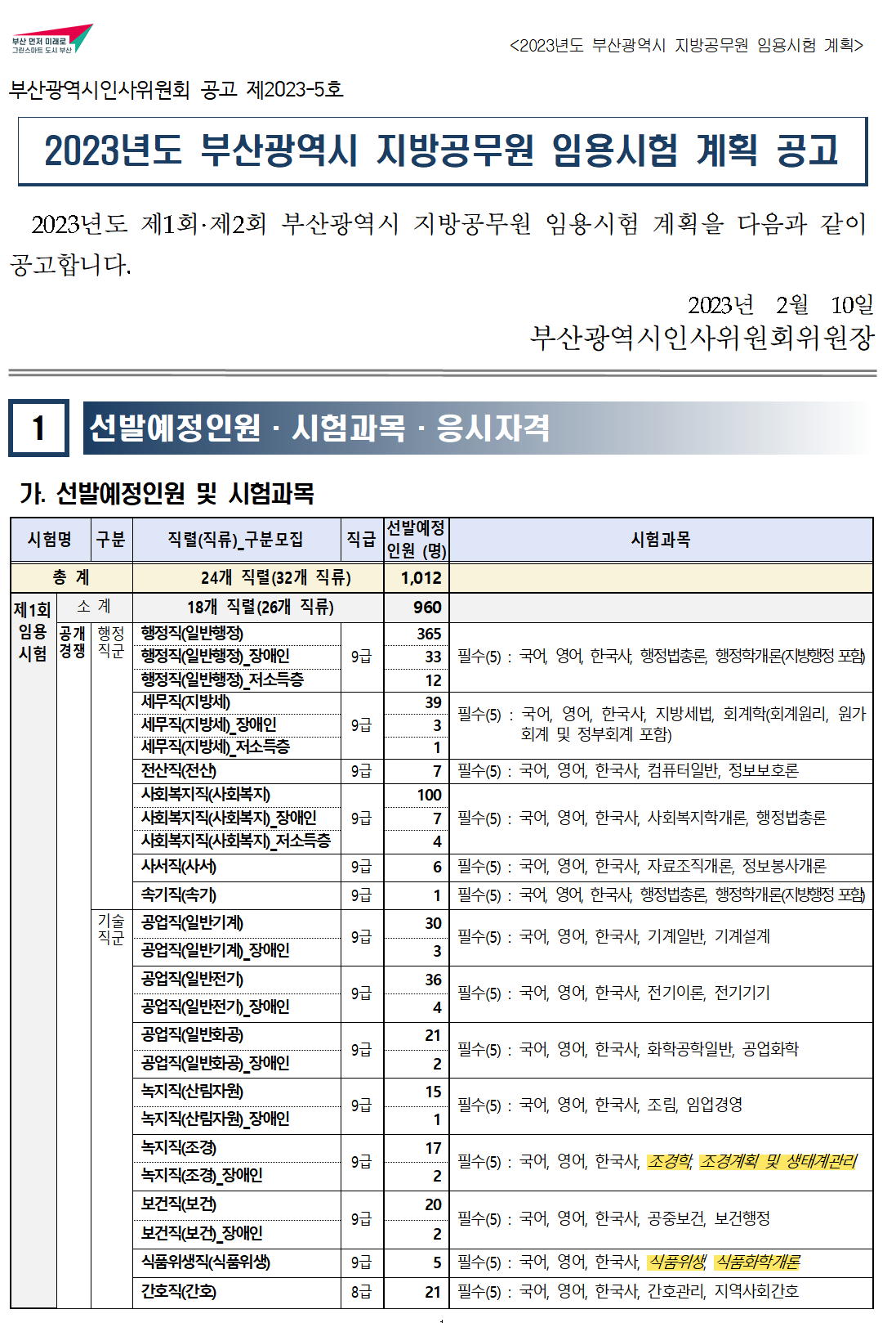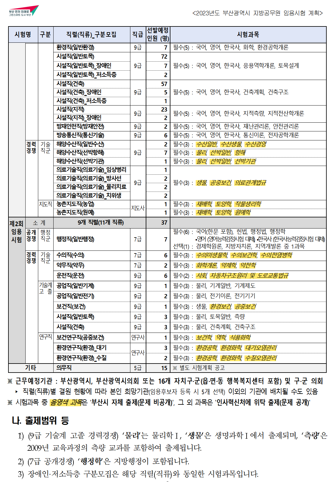 시험공고 - 2023년도 부산광역시 지방공무원 임용시험 계획 공고 : 부산광역시 분야별 통합 (busan.go.kr)