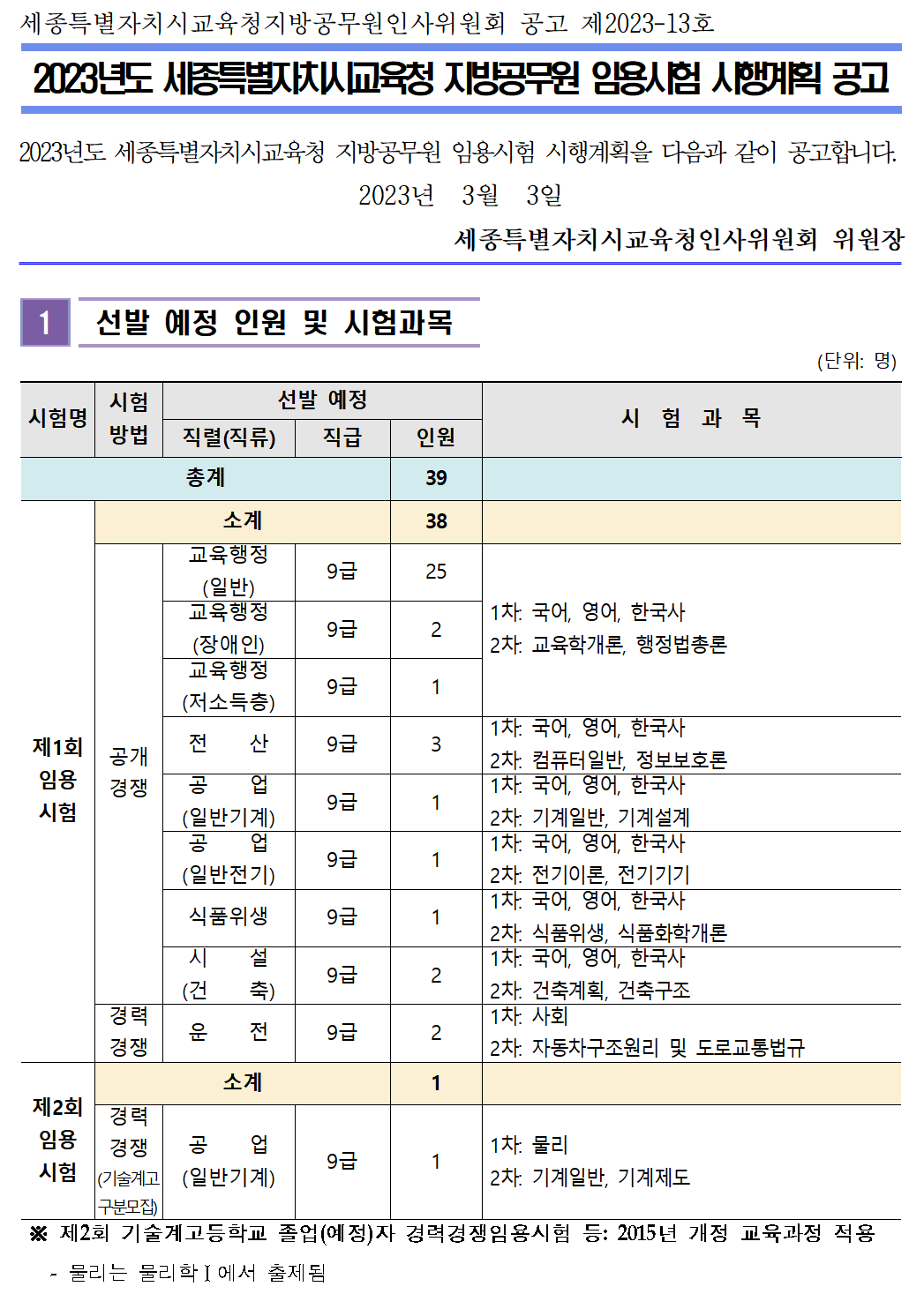 2023년 세종특별자치시교육청(세종교행) 9급 지방공무원(교육행정, 전산, 공업, 식품위생, 시설 등) 선발예정인원입니다.