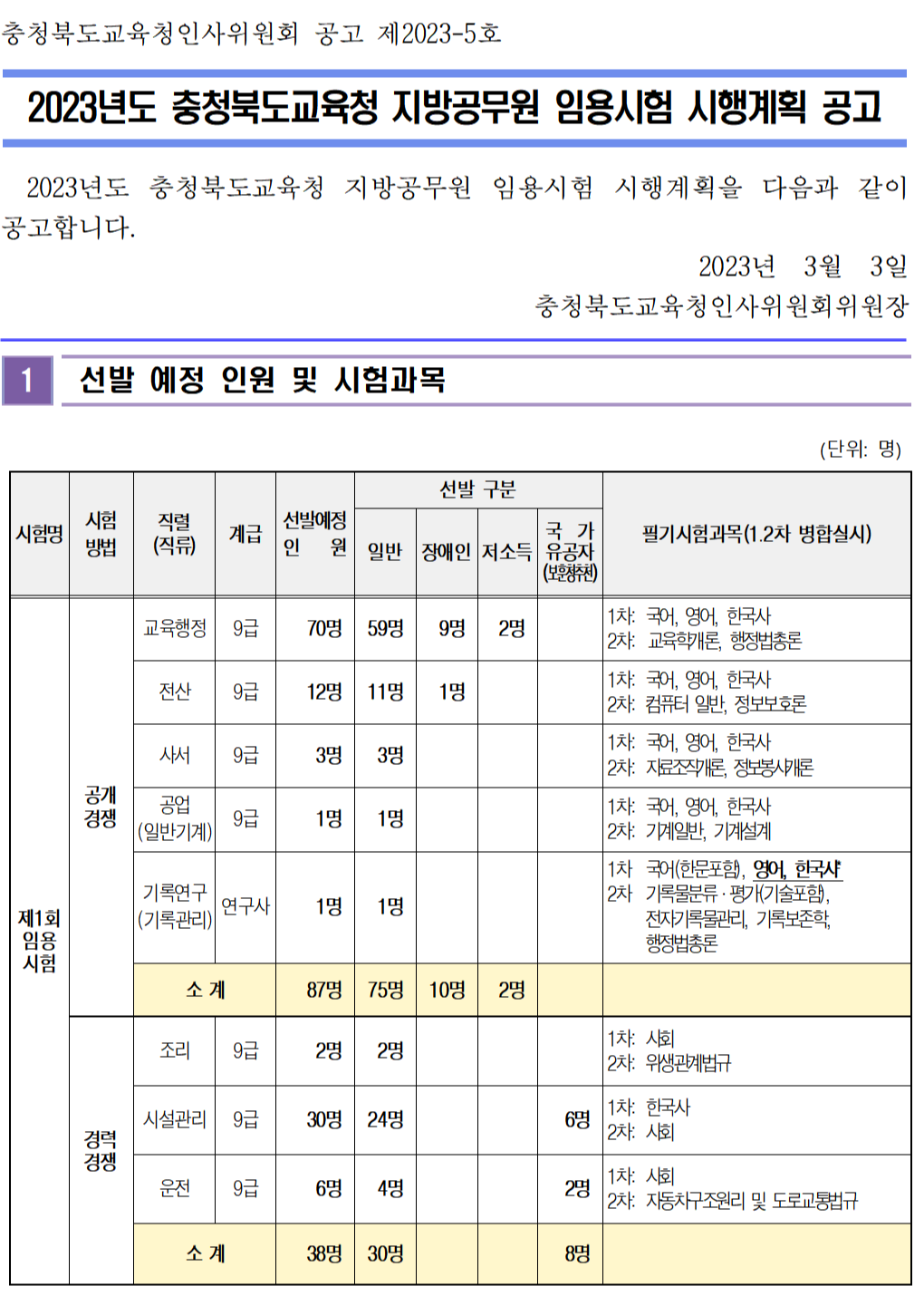 2023년 충청북도교육청(충북교행) 9급 지방공무원(교육행정, 전산, 사서, 공업 등) 선발예정인원입니다.