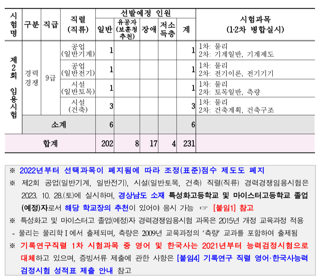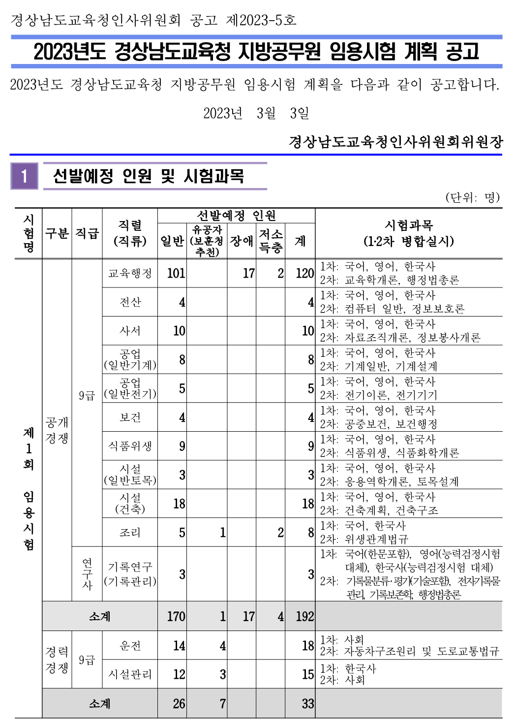 2023년 경상남도교육청(경남교행) 9급 지방공무원(교육행정, 전산 사서, 공업, 보건, 식품위생, 시설, 조리 등) 선발예정인원입니다.