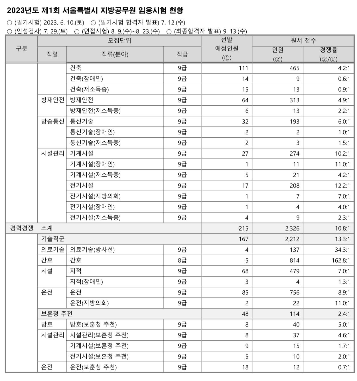 2023년도 제1회 서울특별시 지방공무원 임용시험 원서 접수 현황을 붙임과 같이 공개합니다.