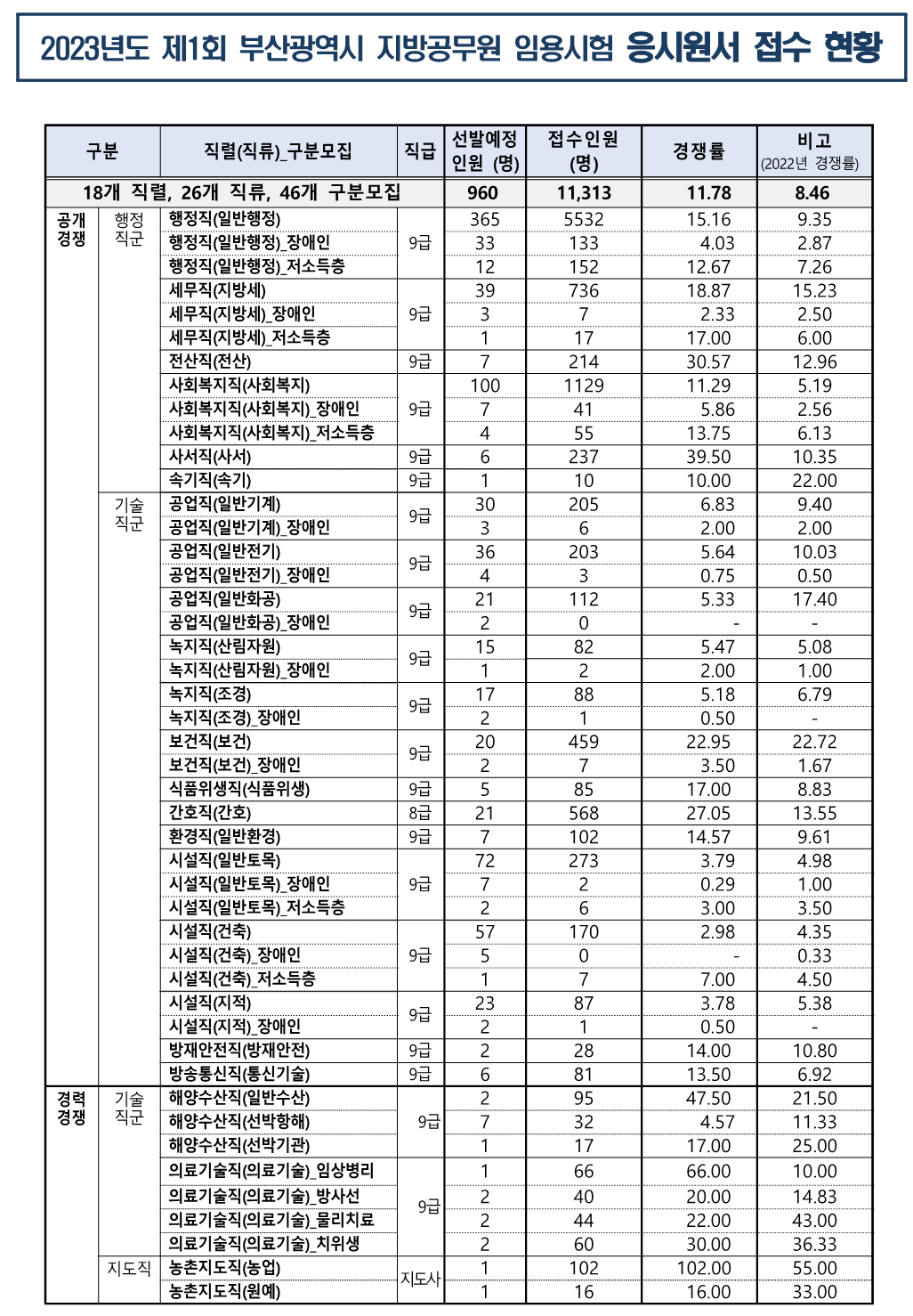 2023년도 제1회 부산광역시 지방공무원(9급 일반행정, 세무, 사회복지, 시설 등) 임용시험 응시원서 접수 현황(경쟁률)입니다.