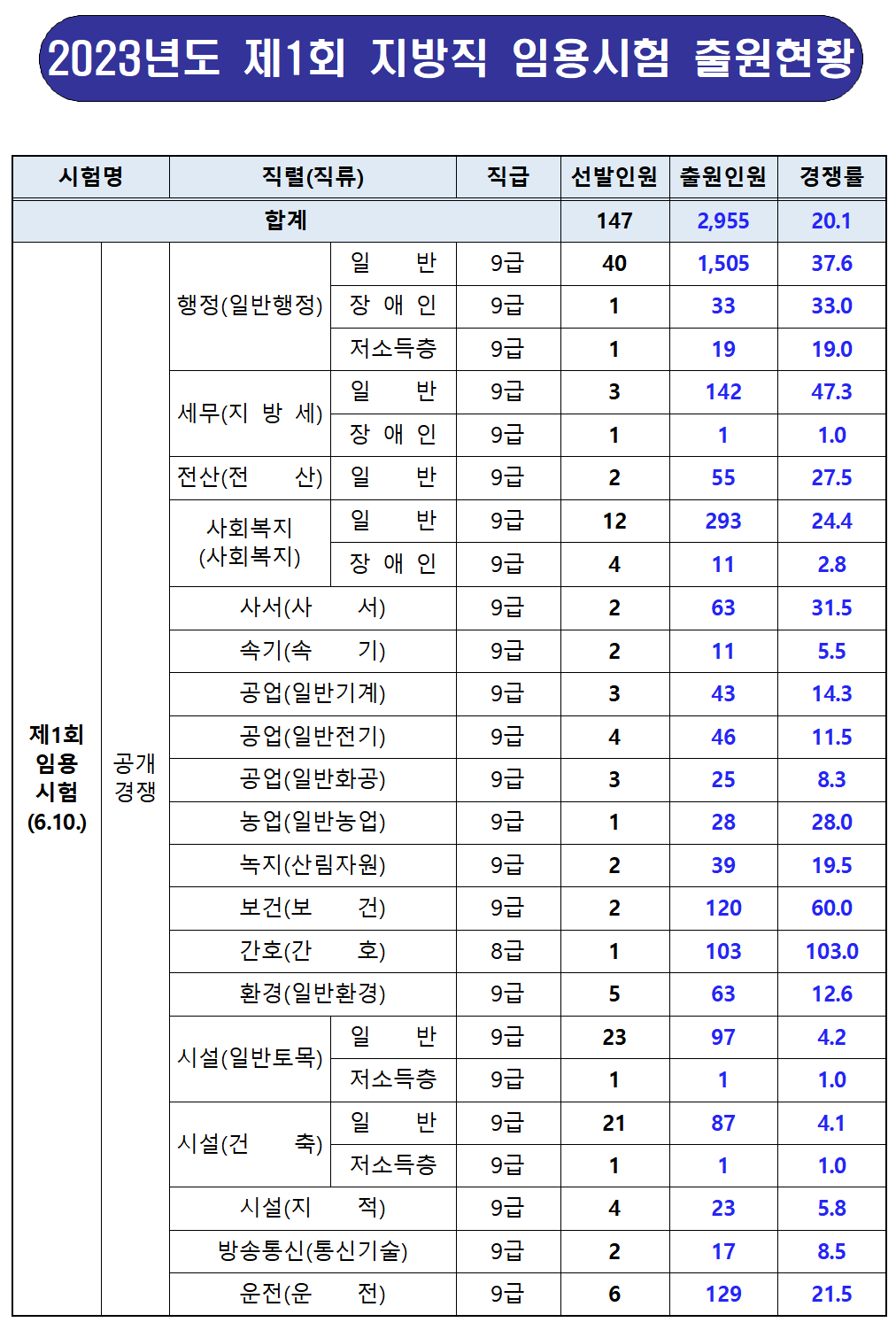 2023년도 제1회 울산광역시 지방공무원(9급 일반행정, 세무, 사회복지, 시설 등) 임용시험 출원자 현황(경쟁률)입니다.