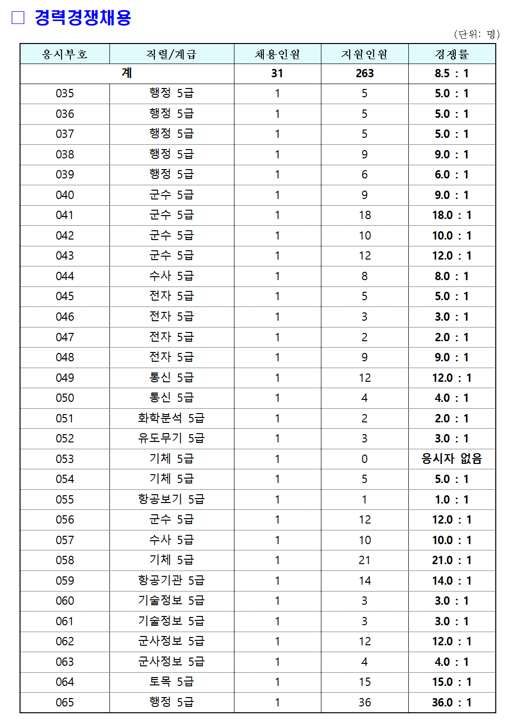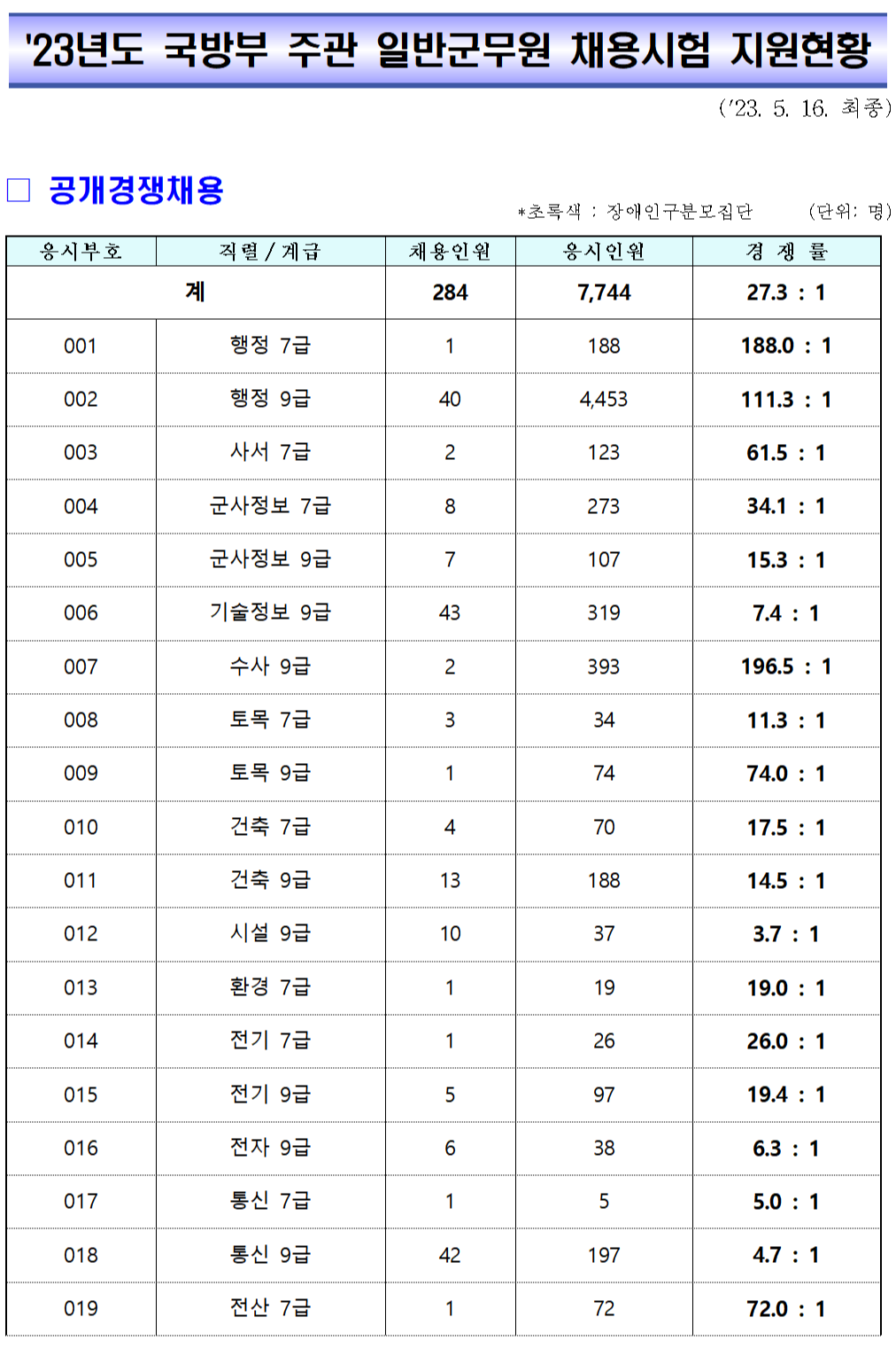 2023년 국방부 주관 일반군무원 채용시험 최종 지원 현황(경쟁률)입니다.