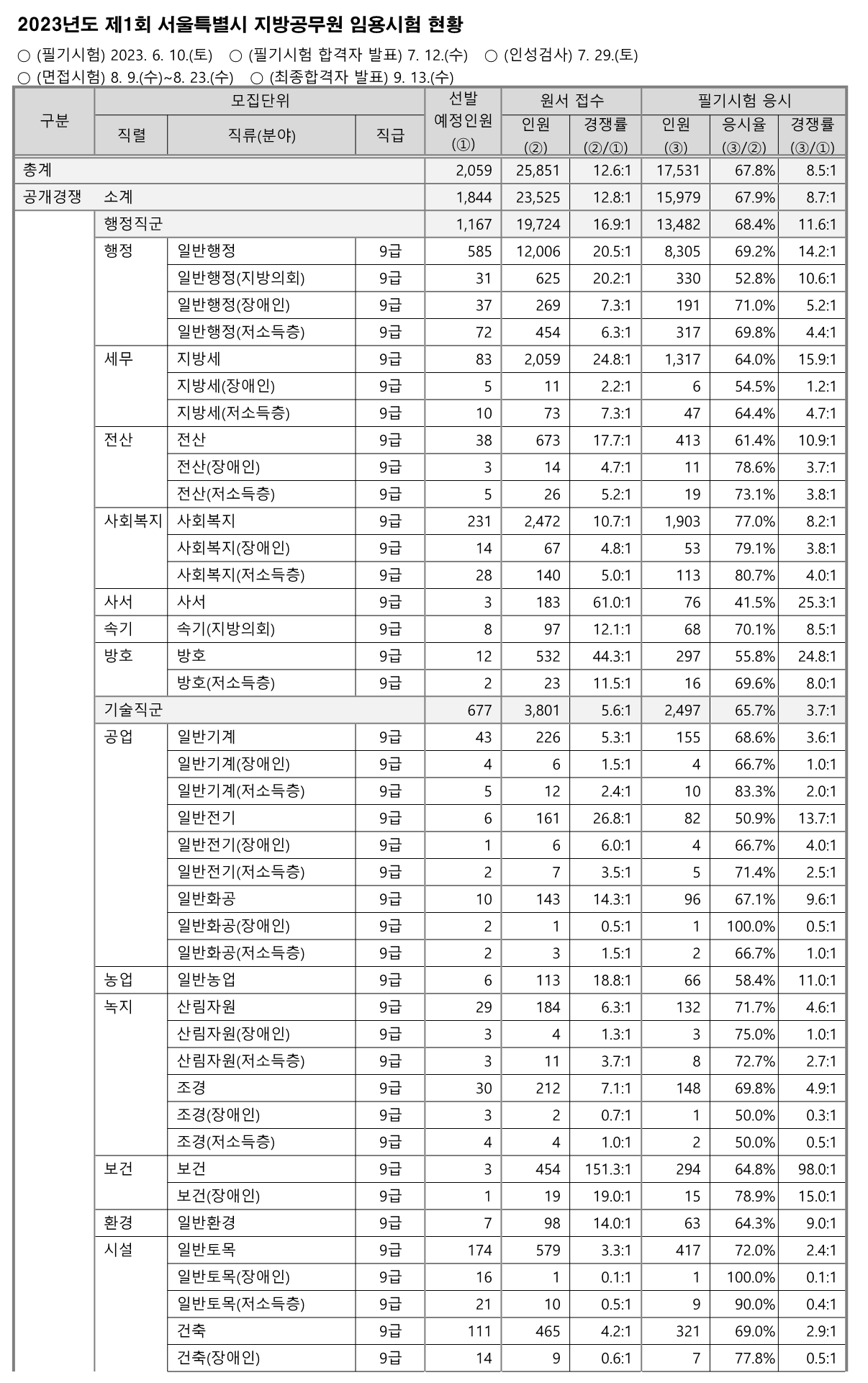 2023년도 제1회 서울특별시 지방공무원 임용시험 필기시험 응시 현황을 붙임과 같이 공개합니다.