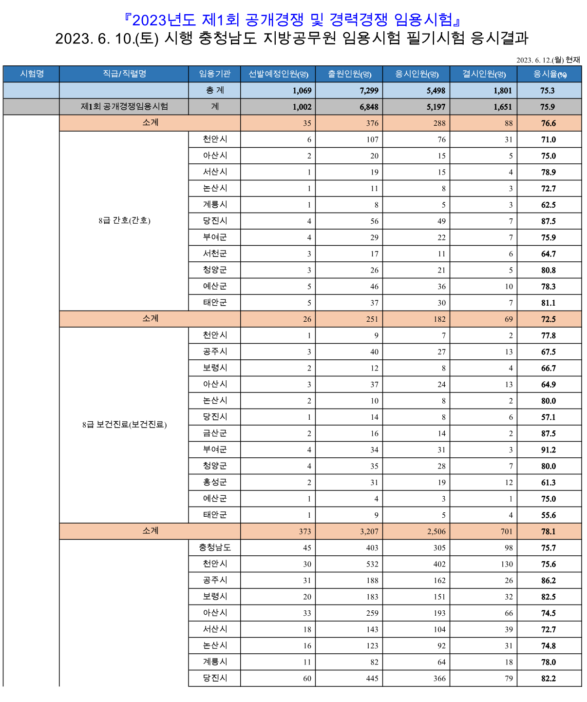 2023. 6. 10.(토) 시행한 2023년도 충청남도 지방공무원 제1회 공개경쟁 및 경력경쟁임용 필기시험 응시결과(최종)를 안내드립니다. 아울러, 필기시험 성적 사전공개 일정을 아래와 같이 안내드리니