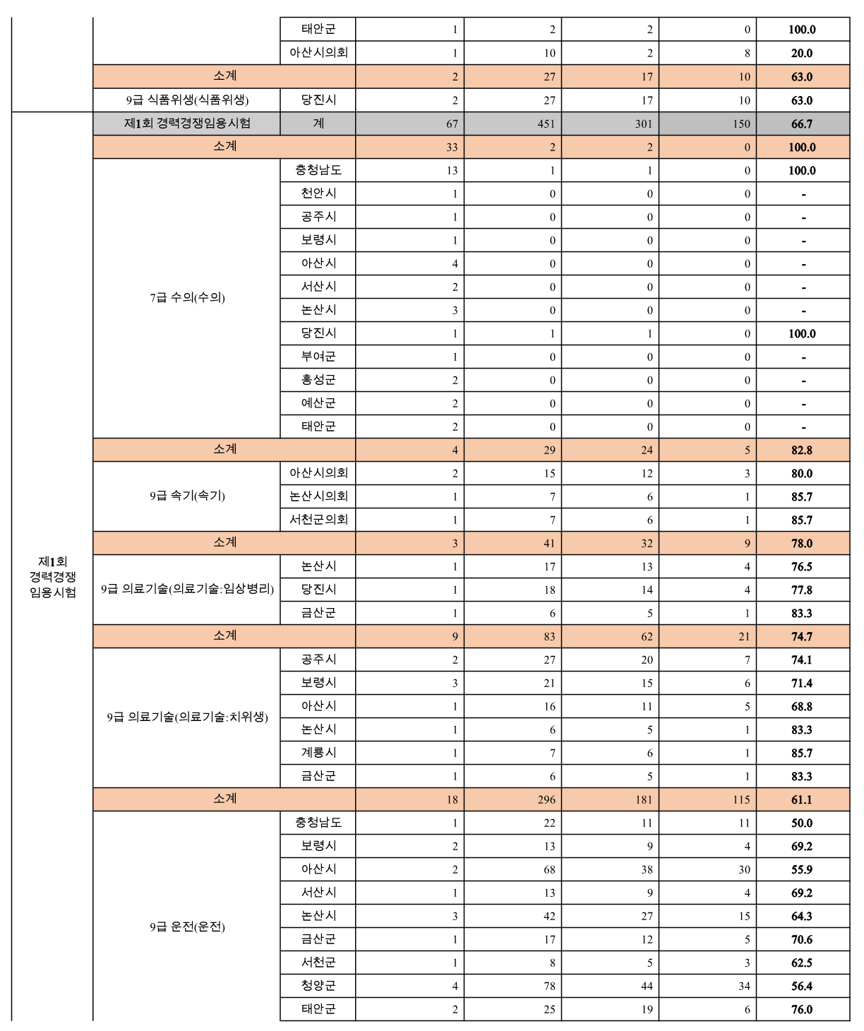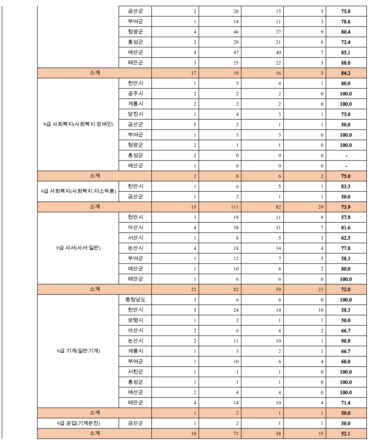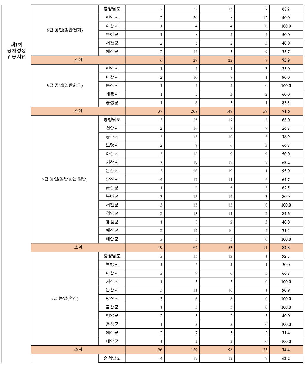 2023년도 제1회 충청남도(충남) 지방직 공무원(9급 일반행정, 세무, 사회복지, 일반토목, 건축 등) 임용 필기시험 응시율입니다.