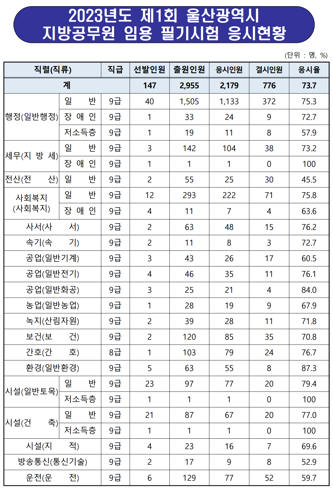 2023년도 제1회 울산광역시 지방공무원(9급 일반행정, 지방세, 사회복지, 일반토목, 건축 등) 임용 필기시험 응시율입니다.
