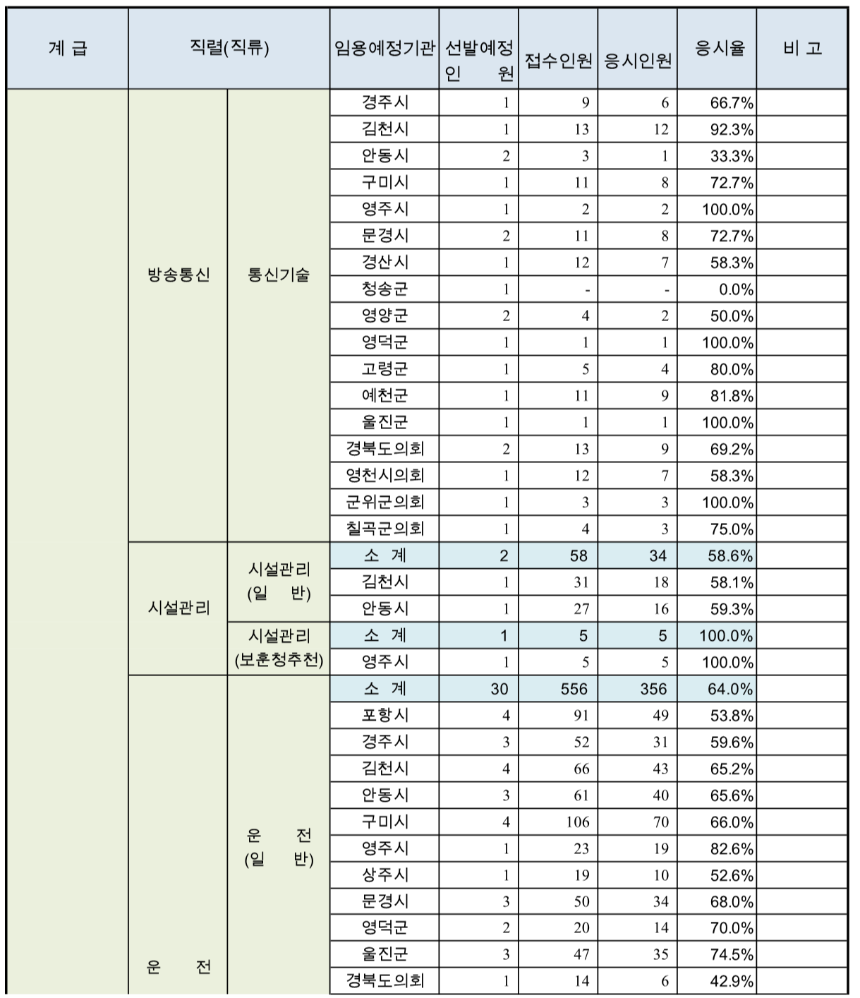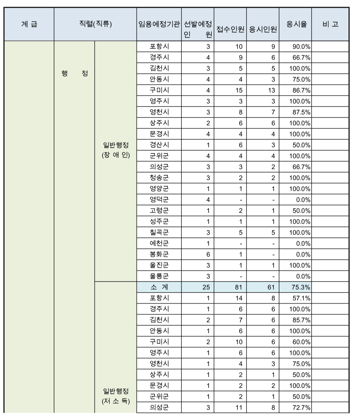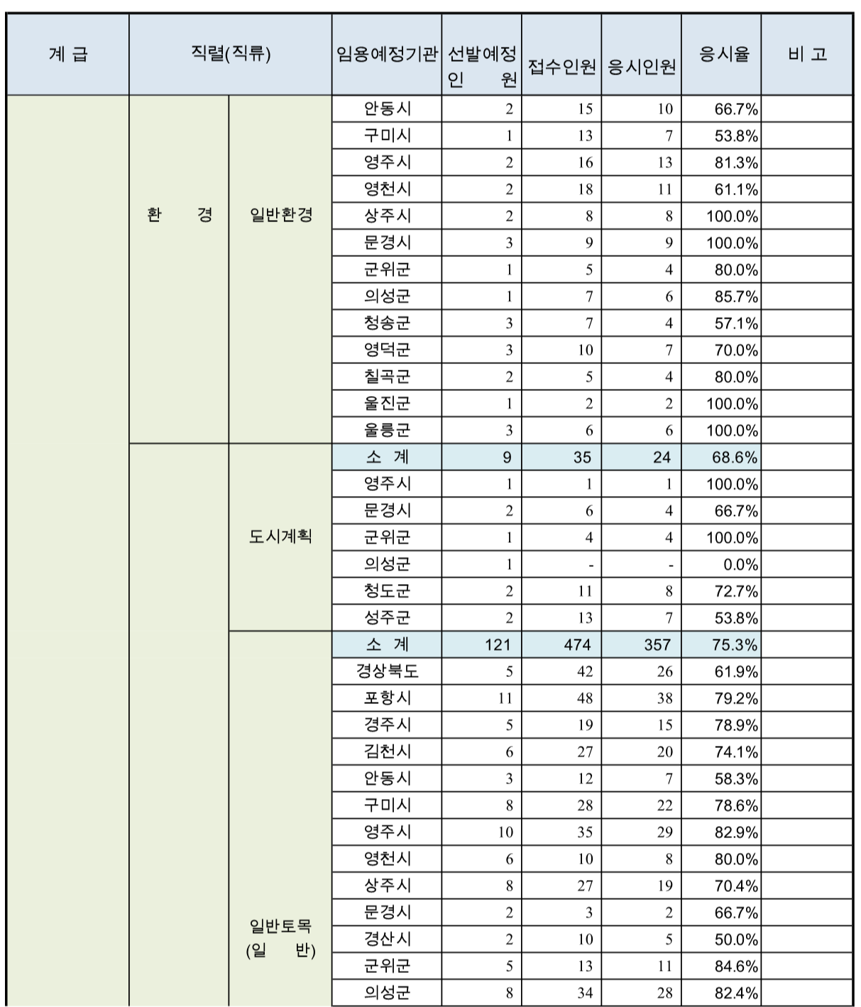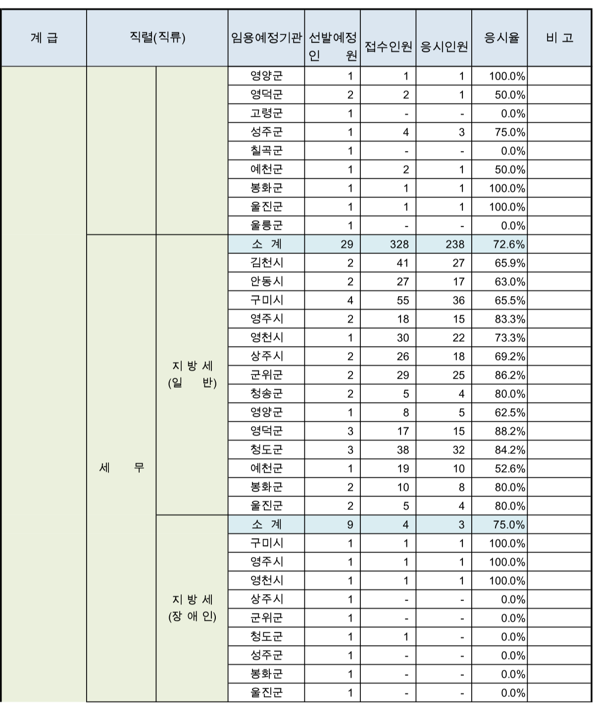 2023년도 제1회 경상북도(경북) 지방공무원(9급 일반행정, 지방세, 사회복지, 일반토목, 건축 등) 임용 필기시험 응시현황(응시율)
