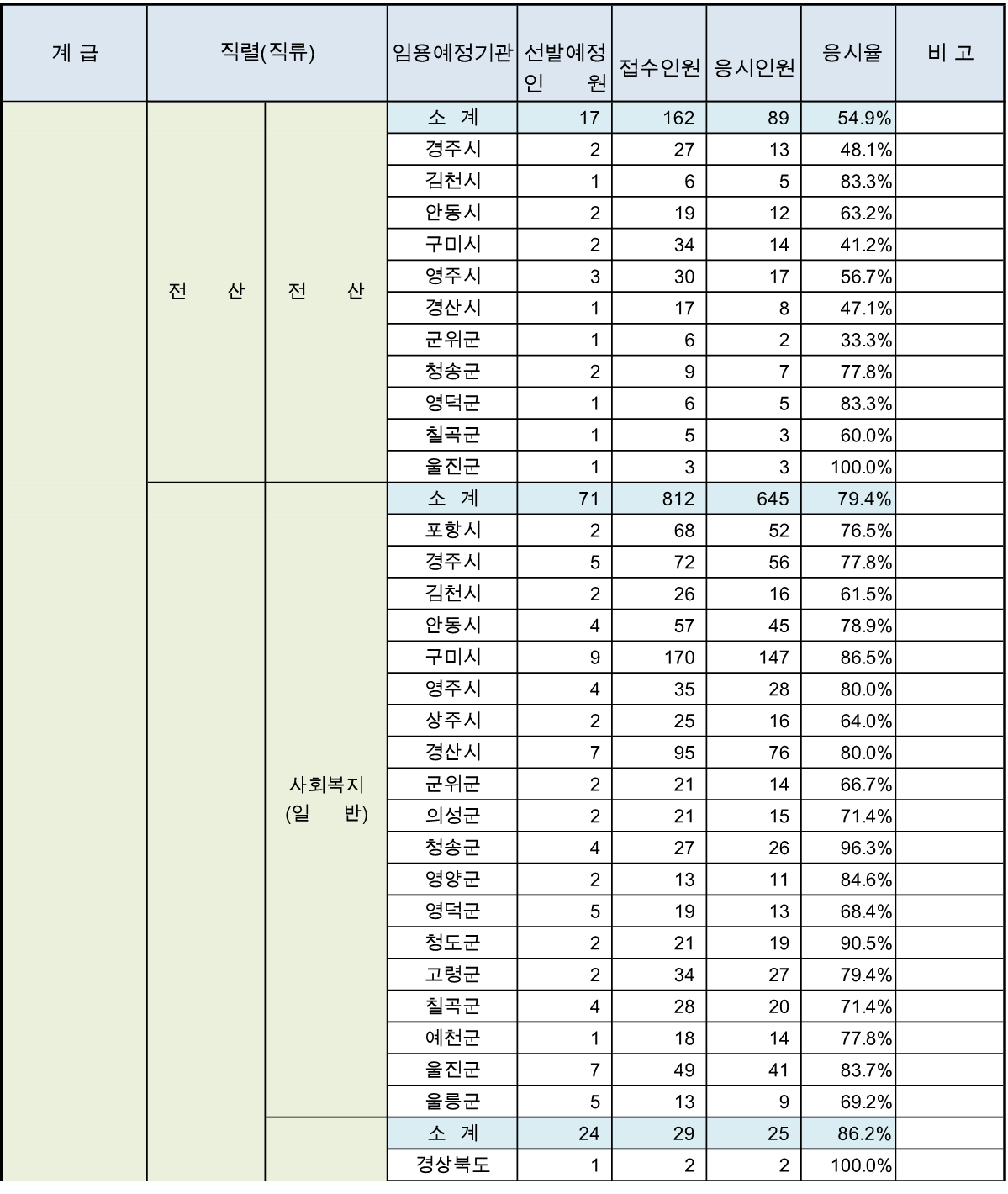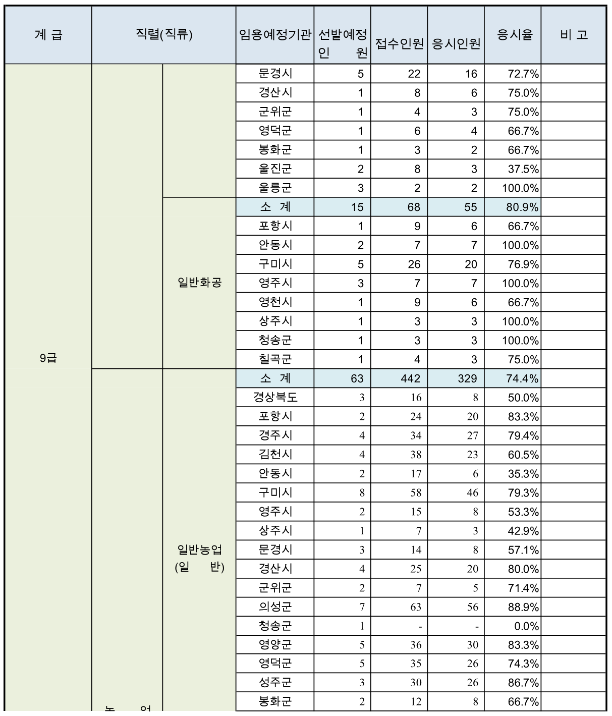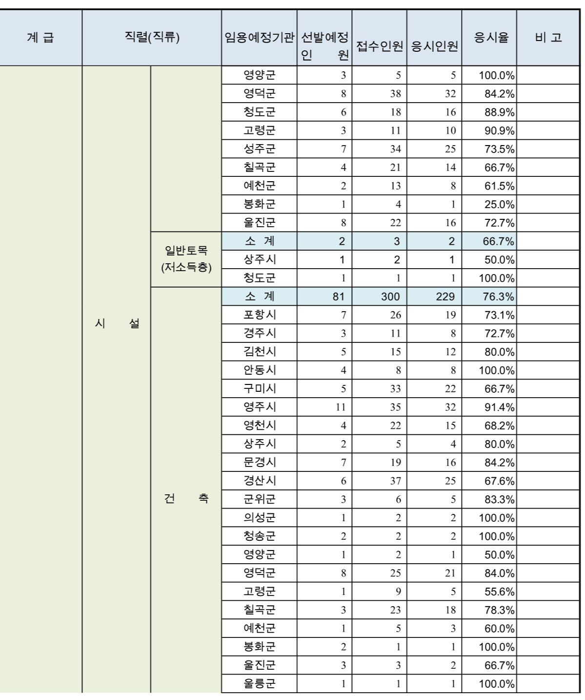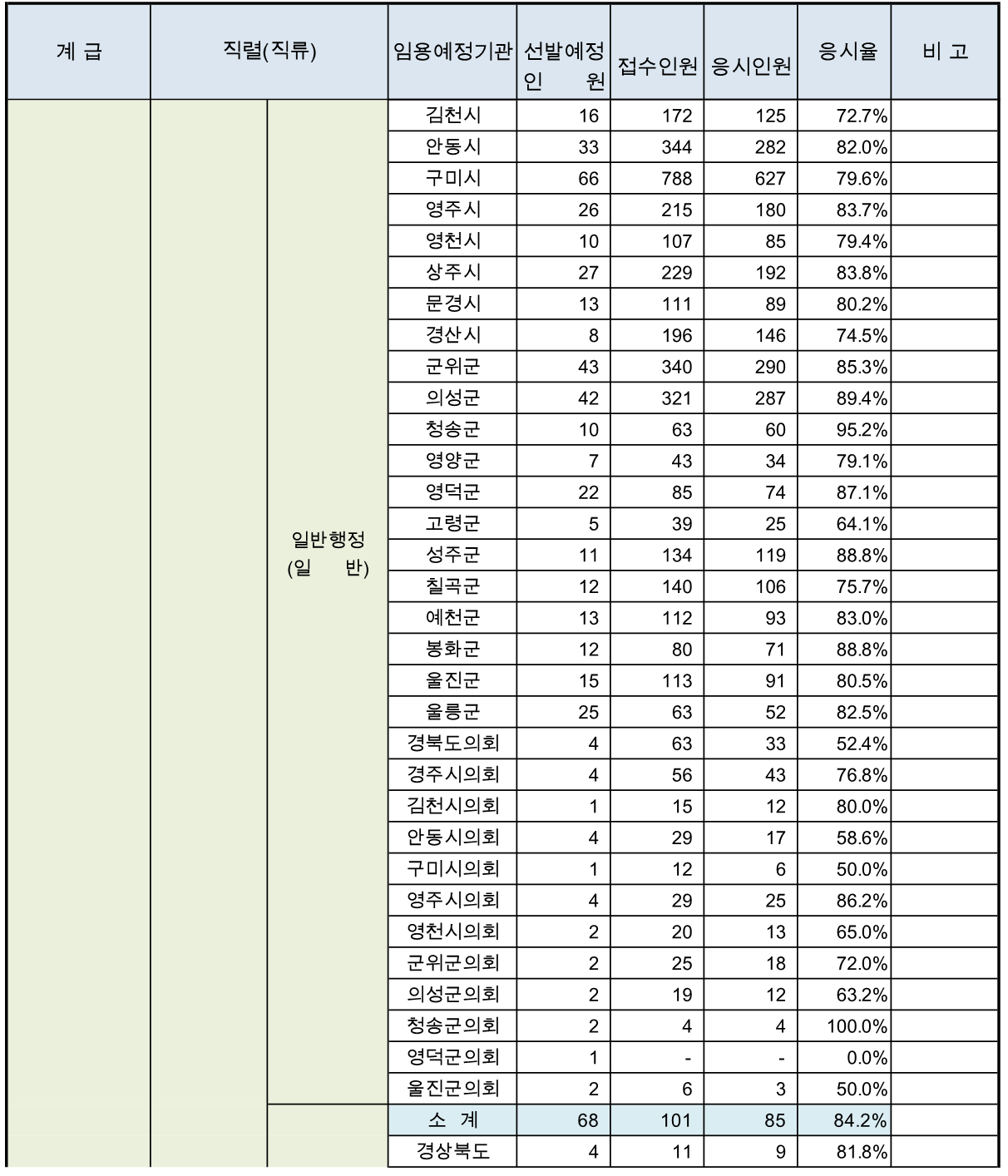 2023년도 제1회 경상북도(경북) 지방공무원(9급 일반행정, 지방세, 사회복지, 일반토목, 건축 등) 임용 필기시험 응시현황(응시율)