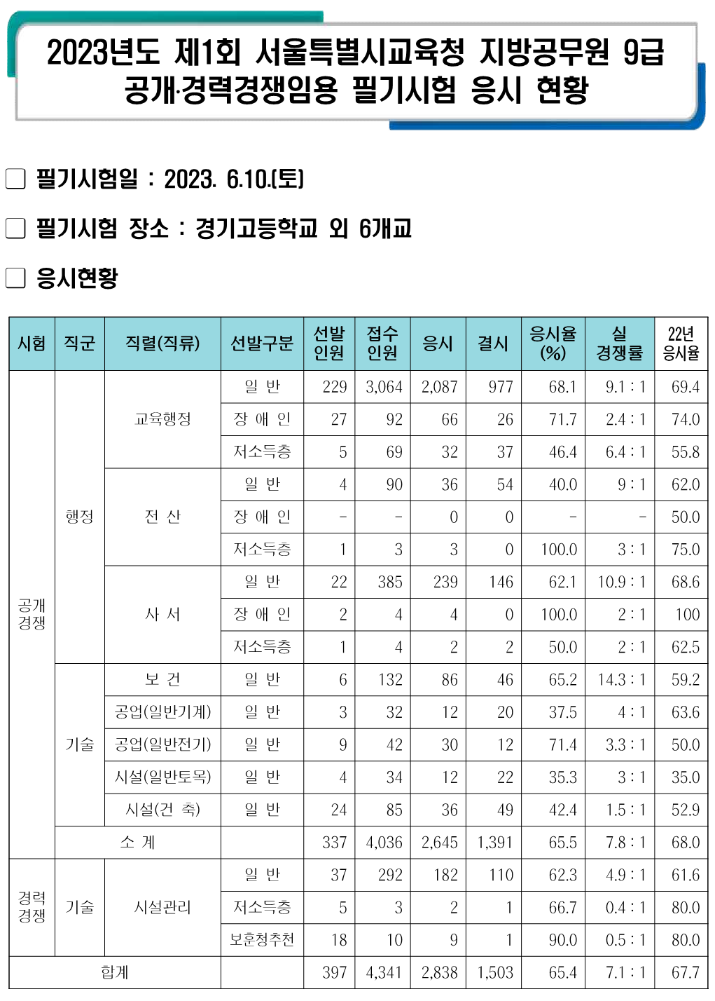 2023년도 제1회 서울특별시교육청 지방공무원(서울교행) 9급 공개경력경쟁임용 필기시험 응시 현황(응시율)입니다.