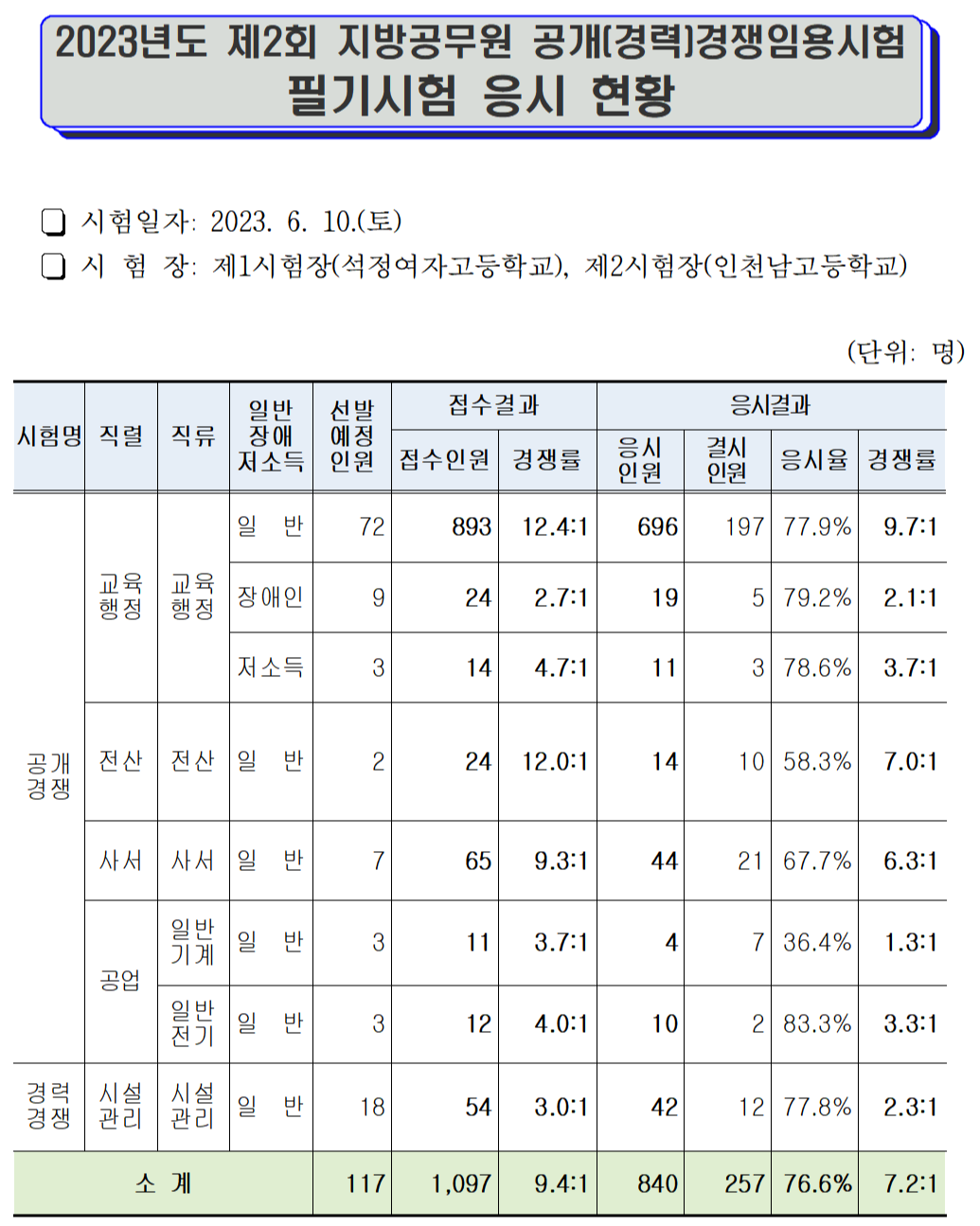 행정정보 - 시험정보 - 시험공고 - 2023년도 제2회 인천광역시교육청 지방공무원 공개(경력)경쟁임용시험 필기시험 응시현황 공개 (ice.go.kr)