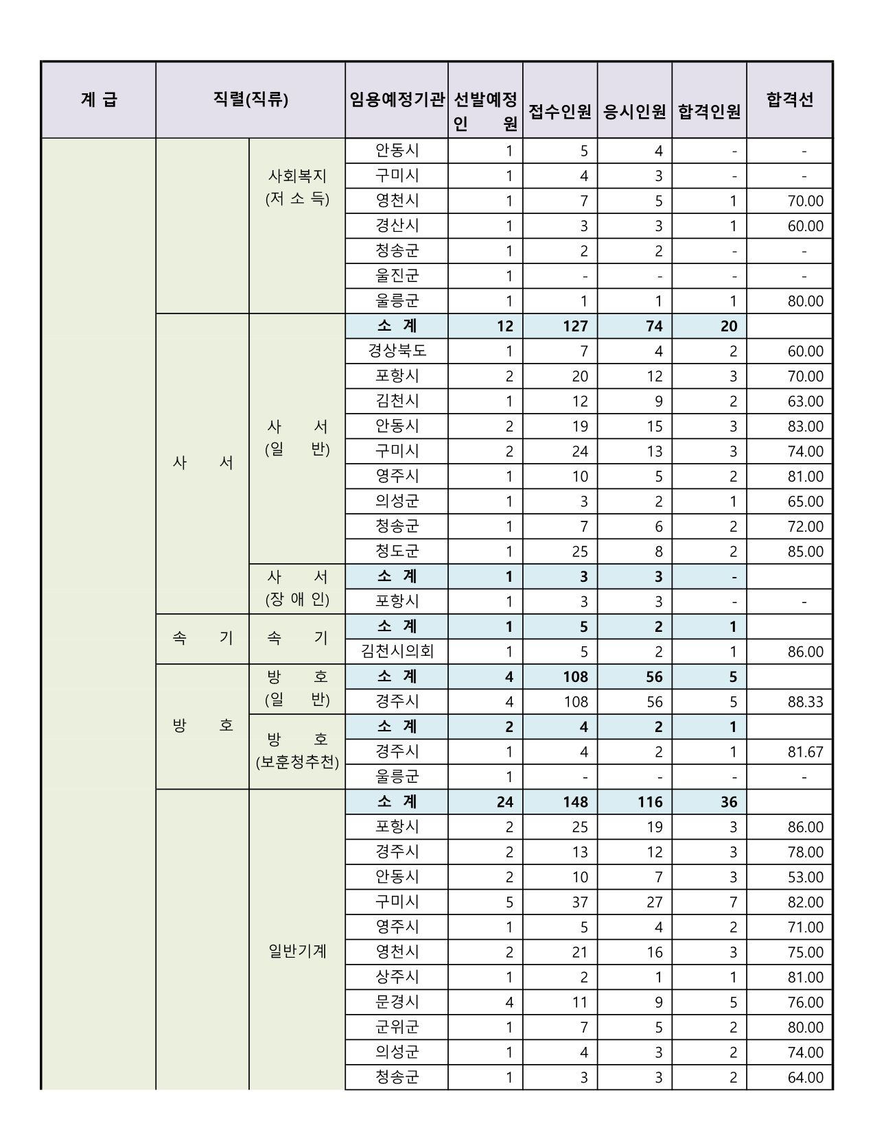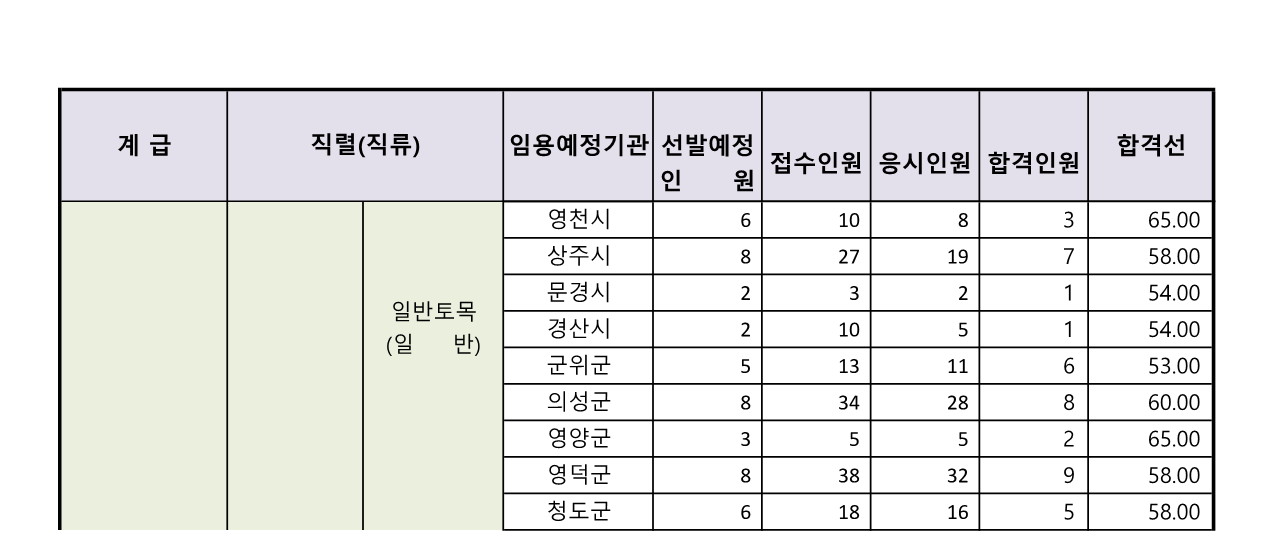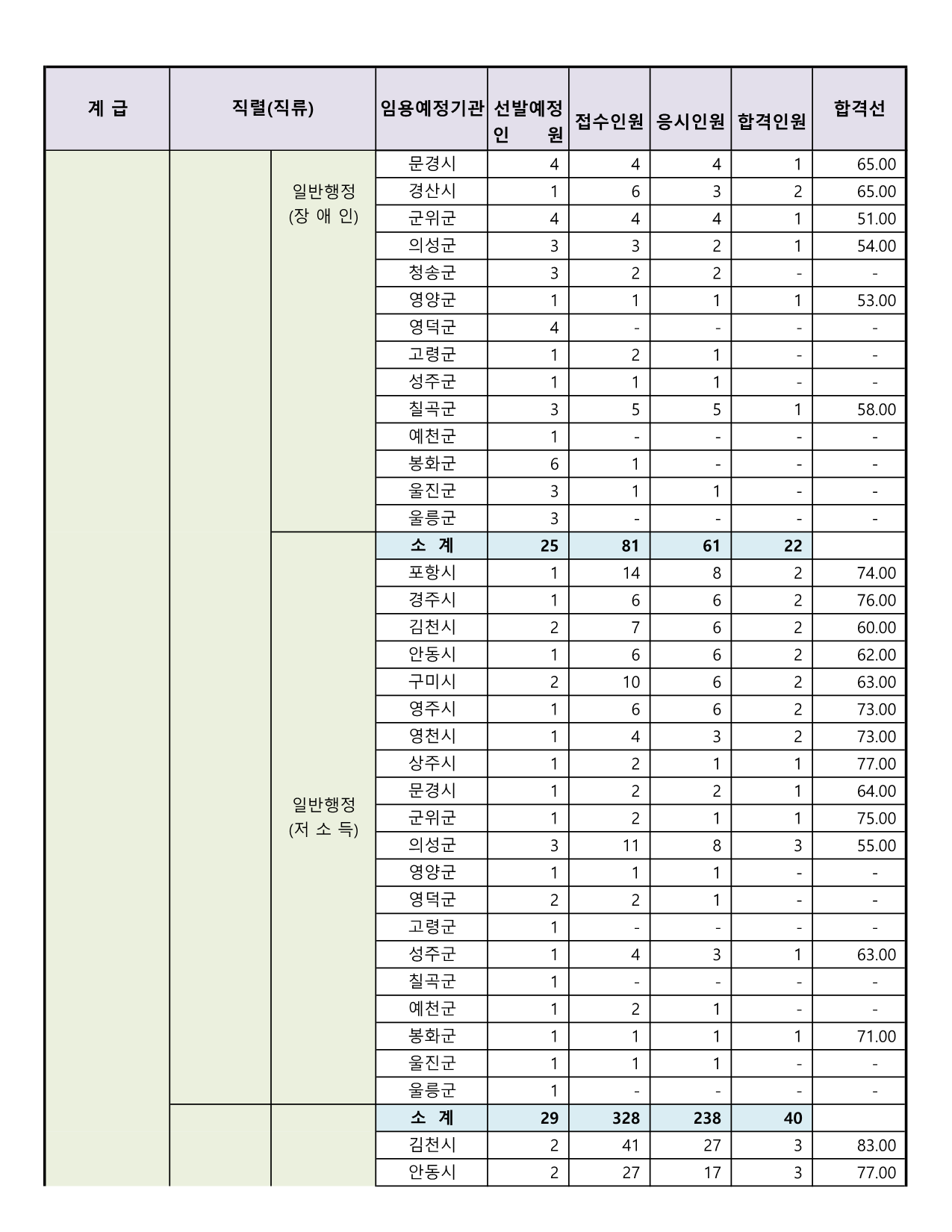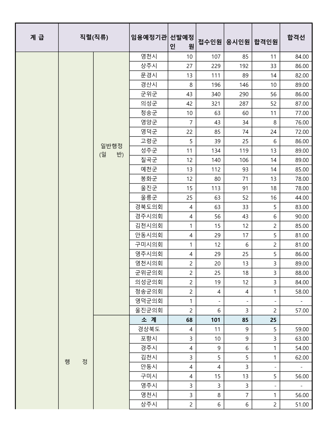 2023년도 제1회 경상북도(경북) 지방공무원(9급, 일반행정, 지방세, 사회복지, 일반토목, 건축 등) 공개경쟁임용시험 합격선(커트라인)