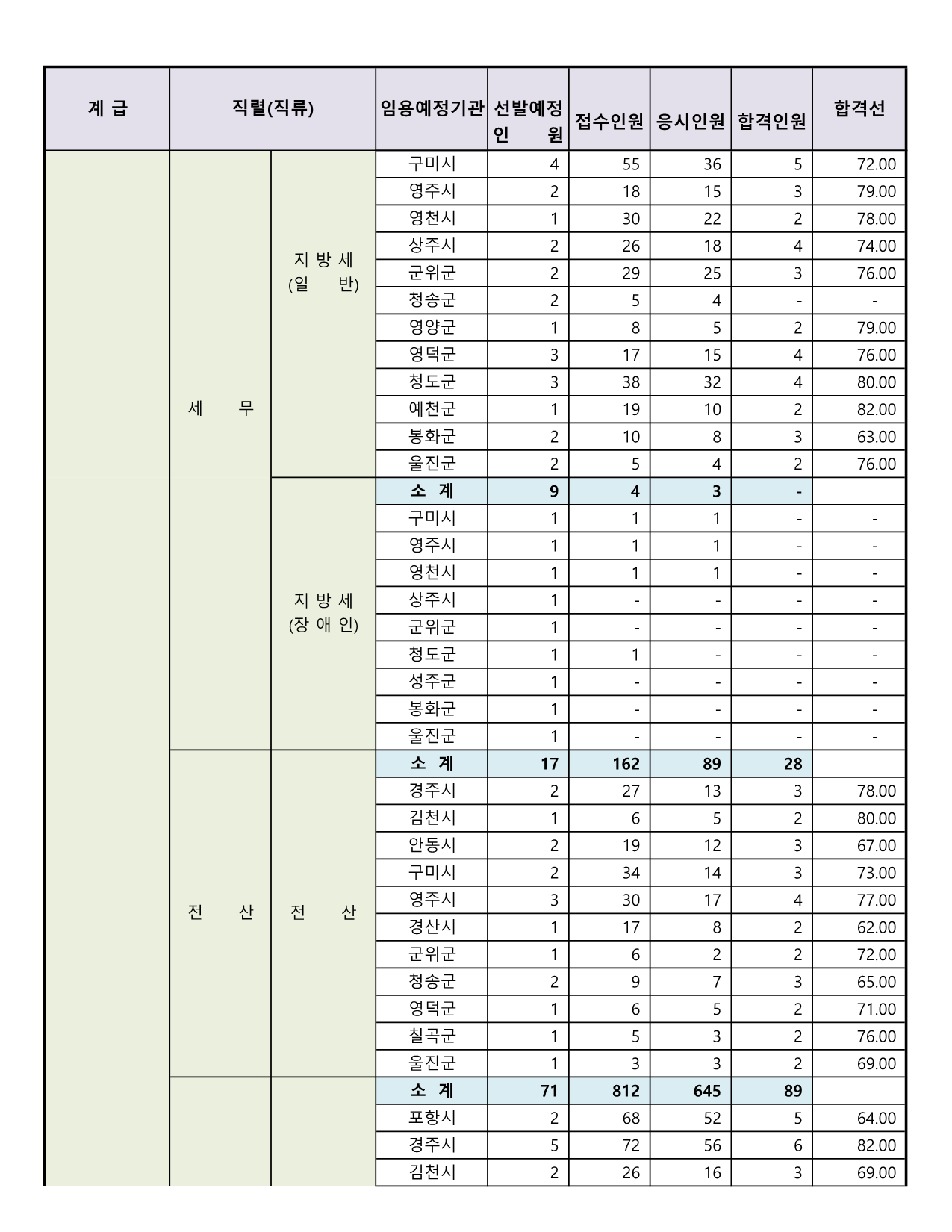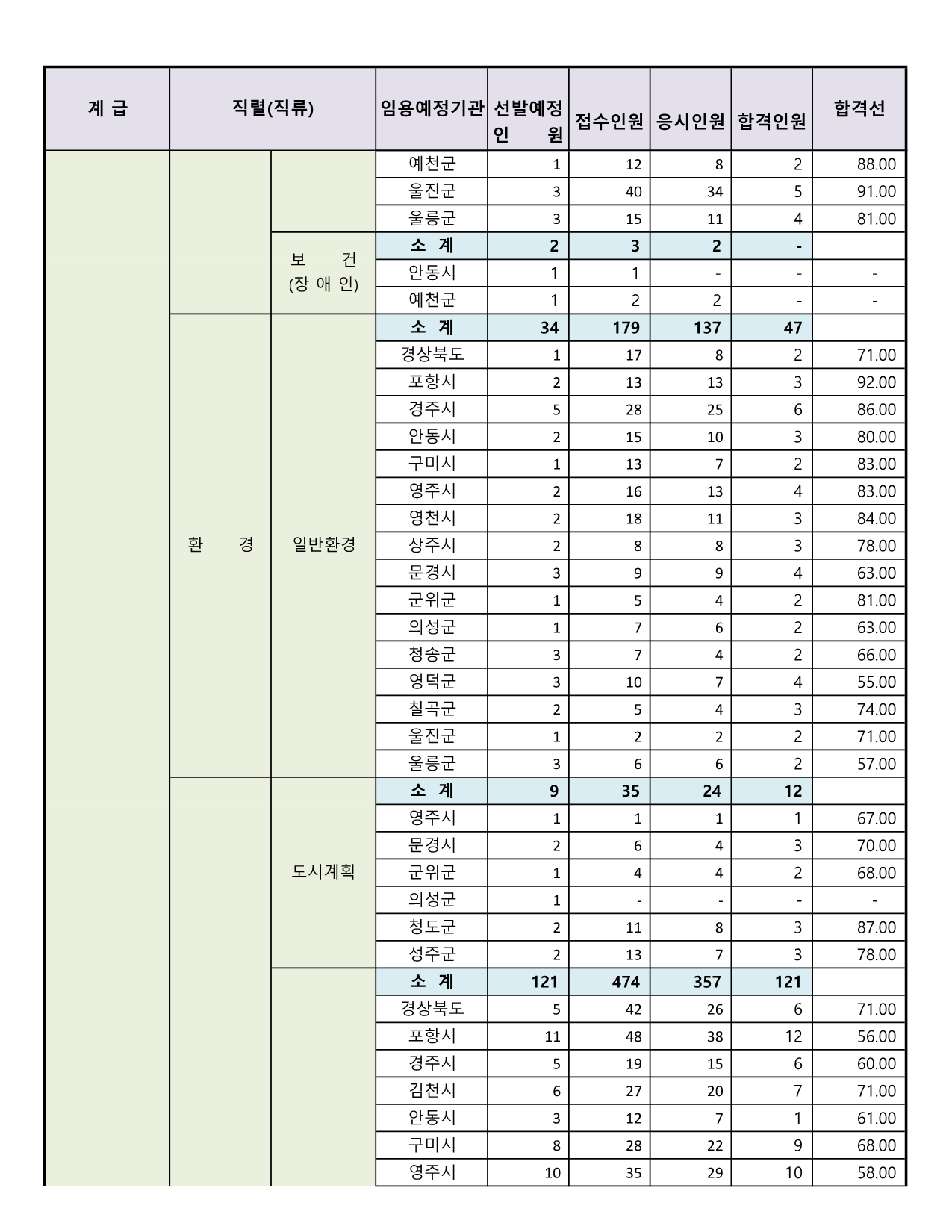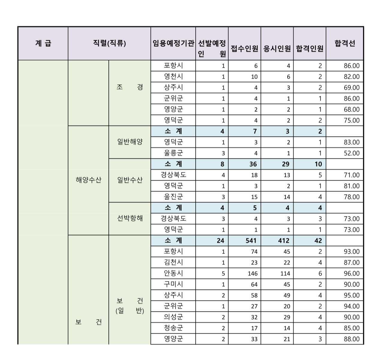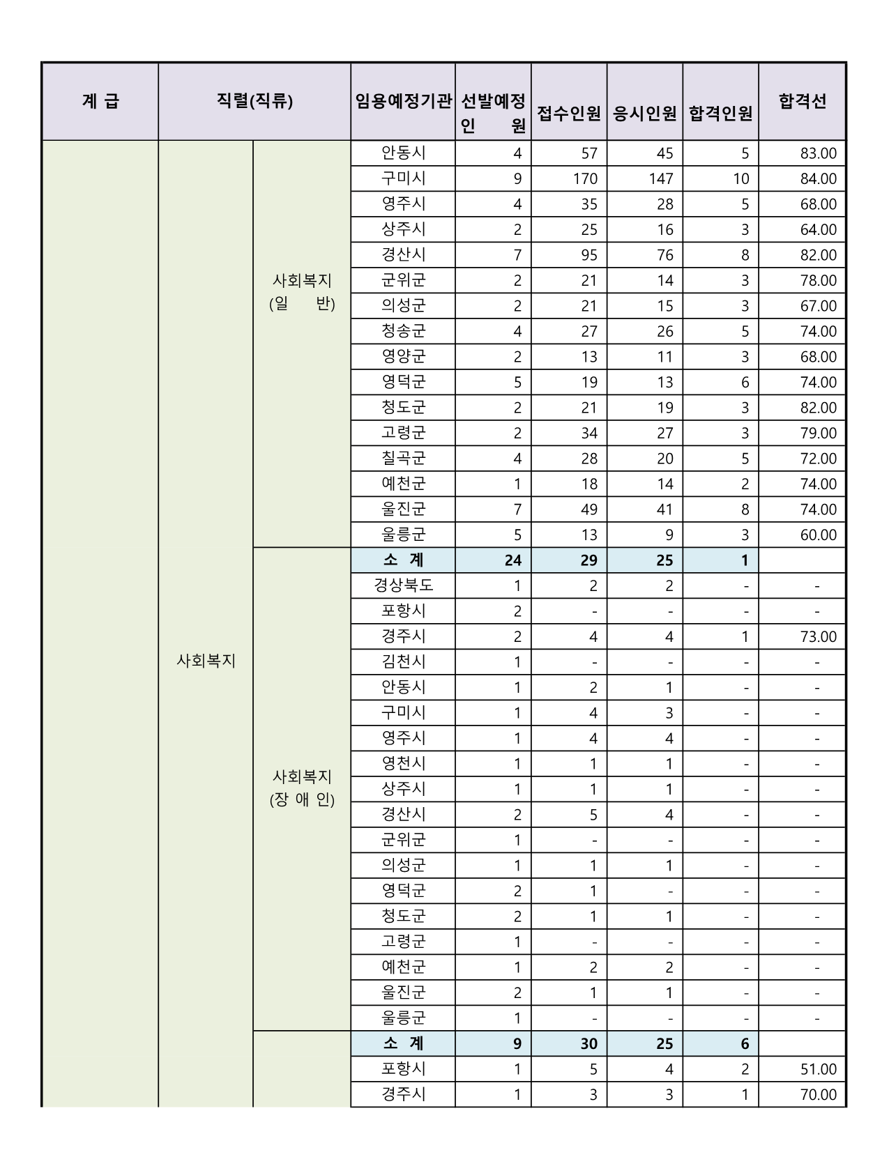 2023년도 제1회 경상북도(경북) 지방공무원(9급, 일반행정, 지방세, 사회복지, 일반토목, 건축 등) 공개경쟁임용시험 합격선(커트라인)