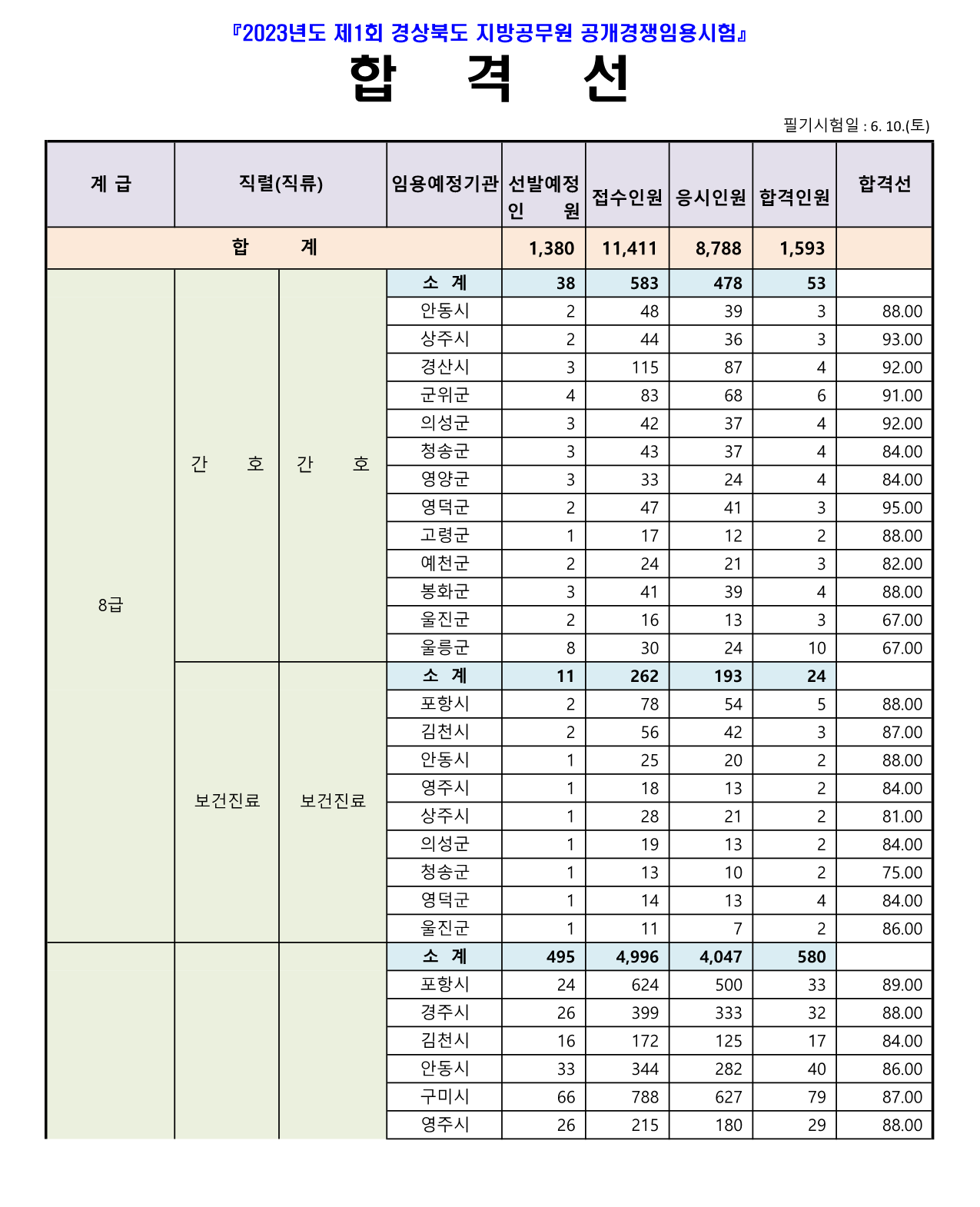 2023년도 제1회 경상북도(경북) 지방공무원(9급, 일반행정, 지방세, 사회복지, 일반토목, 건축 등) 공개경쟁임용시험 합격선(커트라인)입니다.