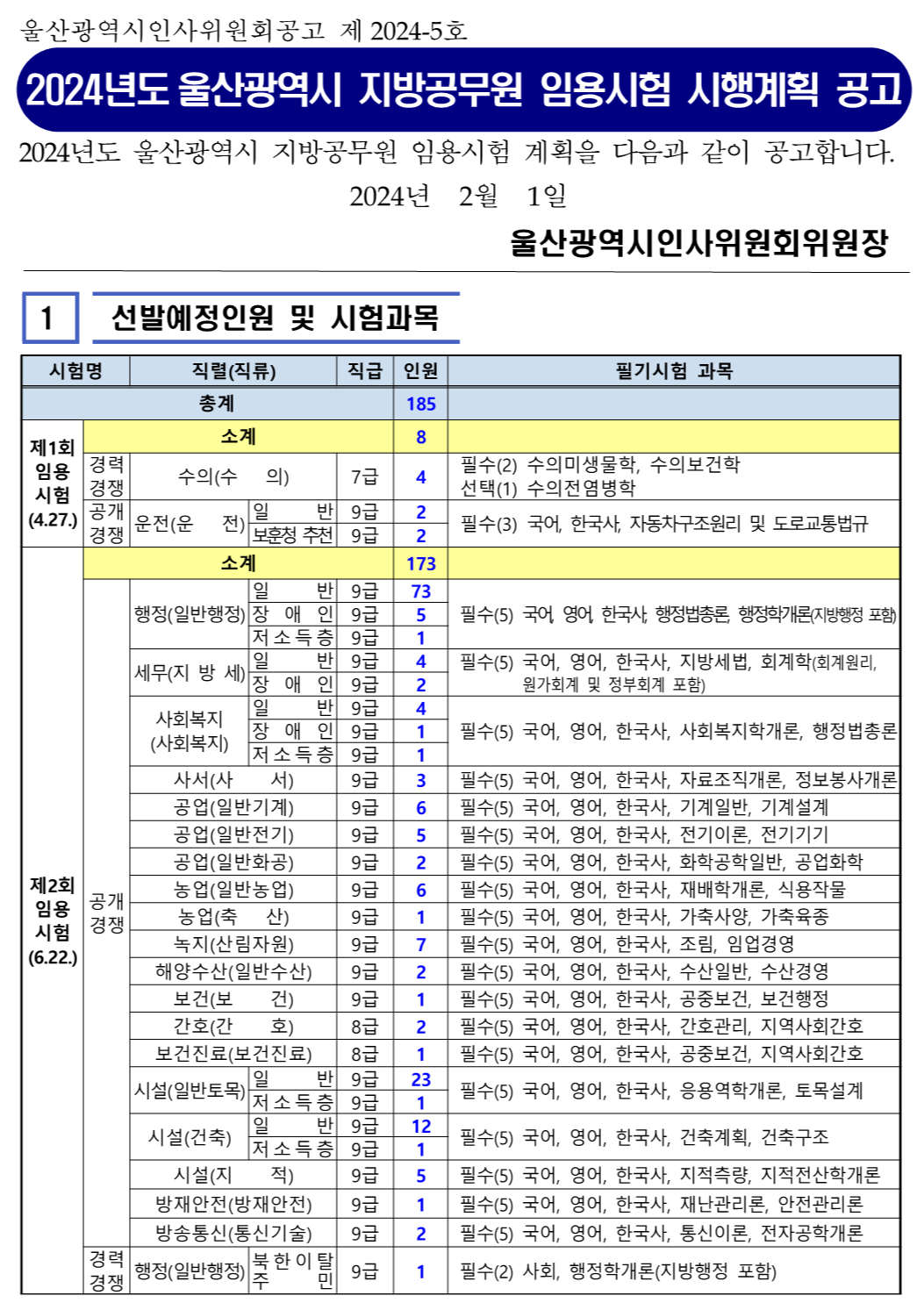 울산광역시인사위원회 공고 제2024-5호 2024년도 울산광역시 지방공무원 임용시험 시행계획을 다음과 같이 공고합니다. ※ 세부내용 공고문 참조 2024년 2월 1일 울산광역시인사위원회위원장
